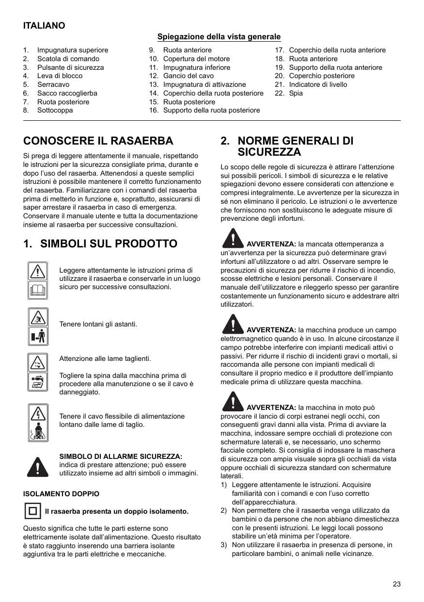 CONOSCERE IL RASAERBA Si prega di leggere attentamente il manuale, rispettando le istruzioni per la sicurezza consigliate prima, durante e dopo l’uso del rasaerba. Attenendosi a queste semplici istruzioni è possibile mantenere il corretto funzionamento del rasaerba. Familiarizzare con i comandi del rasaerba prima di metterlo in funzione e, soprattutto, assicurarsi di saper arrestare il rasaerba in caso di emergenza. Conservare il manuale utente e tutta la documentazione insieme al rasaerba per successive consultazioni.