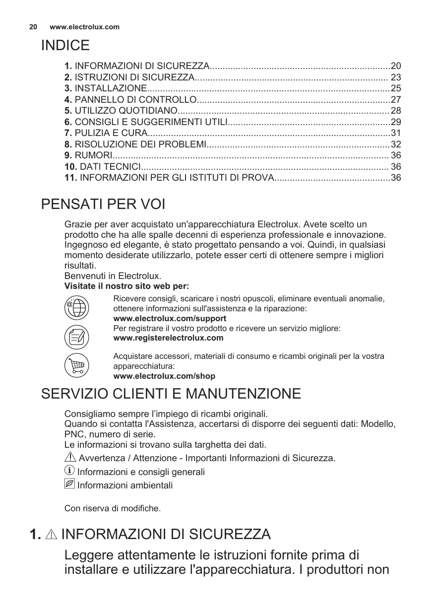 Grazie per aver acquistato un'apparecchiatura Electrolux. Avete scelto un prodotto che ha alle spalle decenni di esperienza professionale e innovazione. Ingegnoso ed elegante, è stato progettato pensando a voi. Quindi, in qualsiasi momento desiderate utilizzarlo, potete esser certi di ottenere sempre i migliori risultati. Benvenuti in Electrolux. Visitate il nostro sito web per: Ricevere consigli, scaricare i nostri opuscoli, eliminare eventuali anomalie, ottenere informazioni sull'assistenza e la riparazione: www.electrolux.com/support Per registrare il vostro prodotto e ricevere un servizio migliore: www.registerelectrolux.com Acquistare accessori, materiali di consumo e ricambi originali per la vostra apparecchiatura: www.electrolux.com/shop