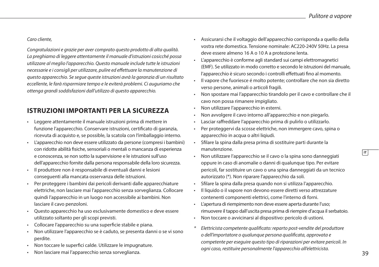 L'apparecchio è conforme agli standard sui campi elettromagnetici (EMF). Se utilizzato in modo corretto e secondo le istruzioni del manuale, l'apparecchio è sicuro secondo i controlli effettuati fino al momento. - Il vapore che fuoriesce è molto potente; controllare che non sia diretto verso persona, animali o articoli fragili.