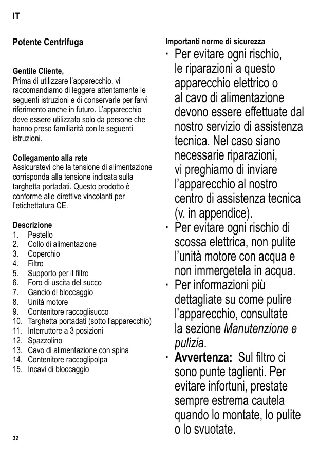 Breng dan de vergrendelclip omlaag en verwijder de stamper en deksel. ∙ Plaats uw linker hand onder de filterhouder en uw rechterhand onder de sapuitgang. Trek de filterhouder met een ‘wiebelende’ beweging omhoog (d.w.z. beurtelings links en rechts) totdat hij eraf komt. ∙ Verwijder de filterhouder en het filter. Sapcontainer Met de deksel op zijn plaats tijdens het uitschenken van het sap zal het schuim, wat tijdens de sap extractie is gevormd, in de container achterblijven. 2. Tubo de alimentación 3. Tapa 4. Filtro 5. Soporte del filtro 6. Salida de zumo 7. Clip de ajuste 8. Unidad de transmisión 9. Recipiente para el zumo 10. Placa de características (en la superficie inferior de la unidad) 11. Interruptor de 3 posiciones 12. Cepillo limpiador 13. Cable de alimentación con clavija 14. Recipiente para la pulpa 15. Huecos de ajuste Instrucciones importantes de seguridad