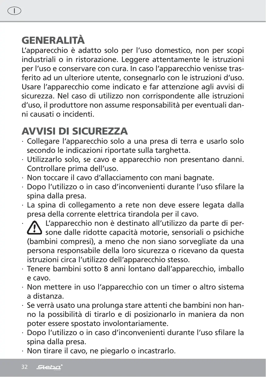 GENERALITÀ L’apparecchio è adatto solo per l’uso domestico, non per scopi industriali o in ristorazione. Leggere attentamente le istruzioni per l’uso e conservare con cura. In caso l’apparecchio venisse trasferito ad un ulteriore utente, consegnarlo con le istruzioni d’uso. Usare l’apparecchio come indicato e far attenzione agli avvisi di sicurezza. Nel caso di utilizzo non corrispondente alle istruzioni d’uso, il produttore non assume responsabilità per eventuali danni causati o incidenti.