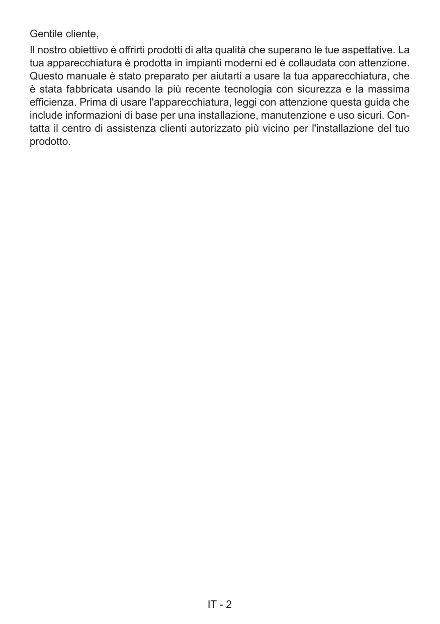 TRASPORTO Se è necessario il trasporto: conservare il contenitore originale del prodotto e trasportarlo usando il contenitore originale se è necessario trasportarlo. Seguire i contrassegni di trasporto sul contenitore. Collocare con del nastro il fornello sulle parti superiori, IT - 17 Gentile cliente, Il nostro obiettivo è offrirti prodotti di alta qualità che superano le tue aspettative. La tua apparecchiatura è prodotta in impianti moderni ed è collaudata con attenzione. Questo manuale è stato preparato per aiutarti a usare la tua apparecchiatura, che è stata fabbricata usando la più recente tecnologia con sicurezza e la massima efficienza. Prima di usare l'apparecchiatura, leggi con attenzione questa guida che include informazioni di base per una installazione, manutenzione e uso sicuri. Contatta il centro di assistenza clienti autorizzato più vicino per l'installazione del tuo prodotto. IT - 2 Contenuti Presentazione e dimensioni del prodotto Avvertenze Preparazione per l'installazione e l'uso Uso del forno Pulizia e manutenzione del prodotto Assistenza e trasporto IT - 3