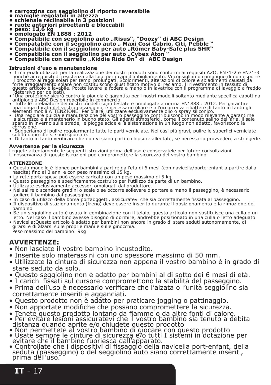 carrozzina con seggiolino di riporto reversibile maniglie regolabili in altezza schienale reclinabile in 3 posizioni ruote anteriori piroettanti e bloccabili peso: 13,6 kg omologato EN 1888 : 2012 Compatibile con seggiolino auto „Risus“, “Doozy” di ABC Design Compatabile con il seggiolino auto „ Maxi Cosi Cabrio, Citi, Pebble “ Compatibile con il seggiolino per auto „Römer Baby-Safe plus SHR“ Compatibile con il seggiolino per auto „Cybex Aton “ Compatibile con carrello „Kiddie Ride On“ di ABC Design Istruzioni d’uso e manutenzione