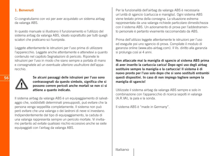 Ci congratuliamo con voi per aver acquistato un sistema airbag da valanga ABS. In questo manuale si illustrano il funzionamento e l’utilizzo del sistema airbag da valanga ABS, ideato soprattutto per tutti quegli sciatori che praticano sci fuoripista. Leggete attentamente le istruzioni per l’uso prima di utilizzare l’apparecchio. Leggete anche attentamente e attenetevi a quanto contenuto nel capitolo Segnalazioni di pericolo. Riponete le istruzioni per l’uso in modo che siano sempre a portata di mano e consegnatele ad un eventuale ulteriore usufruitore dell’apparecchio.