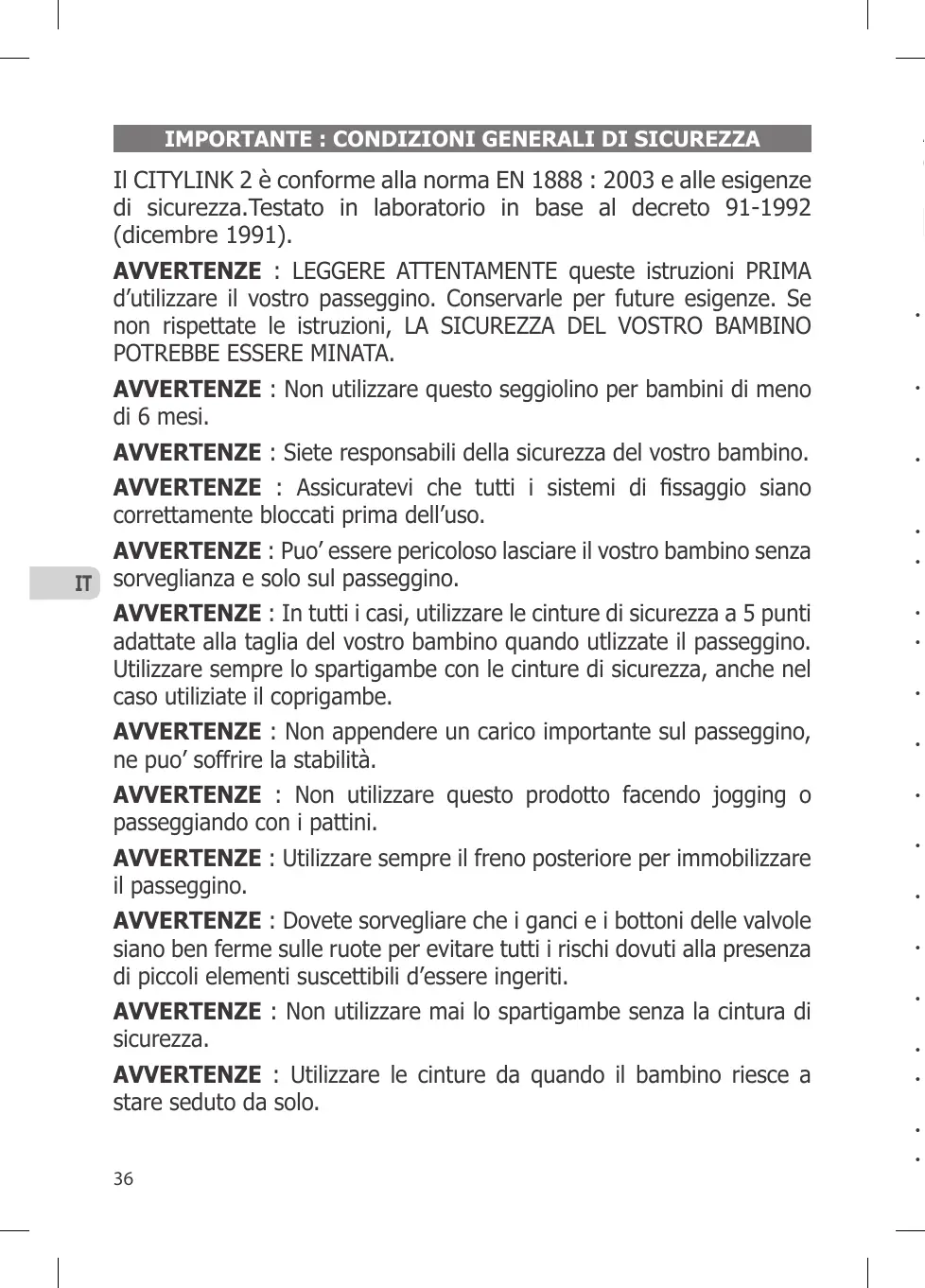 AVERTISSEMENT: Vous êtes responsable de la sécurité de votre enfant. FR AVERTISSEMENT: S’assurer que tous les dispositifs de verrouillage sont correctement enclenchés avant utilisation. AVERTISSEMENT: Il peut être dangereux de laisser votre enfant sans surveillance. AVERTISSEMENT: En toutes circonstances, attachez l’enfant avec le harnais de sécurité à 5 points ajusté à sa taille lorsque vous utilisez la poussette. Toujours utiliser la sangle de l’entrejambe avec le harnais de sécurité, même si vous utilisez une chancelière. AVERTISSEMENT: Le fait d’accrocher au poussoir une charge influe sur la stabilité de la poussette / du landau. AVERTISSEMENT: Ne pas utiliser ce produit en faisant du jogging ou des promenades en rollers. AVERTISSEMENT: Utilisez toujours le frein arrière au pied pour immobiliser la poussette. AVERTISSEMENT: Vous devez veiller à ce que les molettes et les bouchons des valves soient fermement vissés sur les roues pour éviter tout risque dû à la présence de petits éléments susceptibles d’être ingérés. AVERTISSEMENT: Ne jamais utiliser l’entrejambe sans la ceinture de maintien. AVERTISSEMENT: Utilisez un harnais dès que l’enfant peut tenir assis tout seul. 27