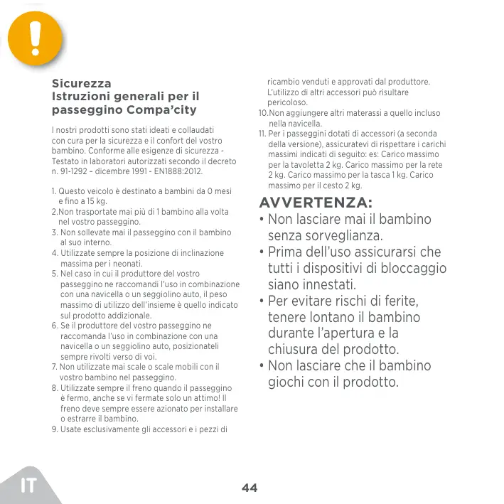 Sicurezza Istruzioni generali per il passeggino Compa’city ricambio venduti e approvati dal produttore. L’utilizzo di altri accessori può risultare pericoloso. 10.Non aggiungere altri materassi a quello incluso nella navicella.