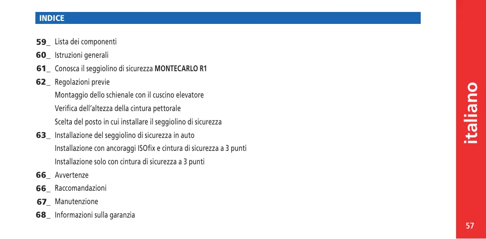 Assurez-vous que, à l’intérieur du véhicule, les bagages et tout autre objet susceptible de causer des dommages en cas d’accident, sont dûment fixés ou rangés. En voiture, le siège auto MONTECARLO R1 doit toujours être fixé à l’aide des ceintures de sécurité, même s’il n’est pas occupé par l’enfant car, en cas d’accident, il pourrait être projeté et blesser les occupants du véhicule