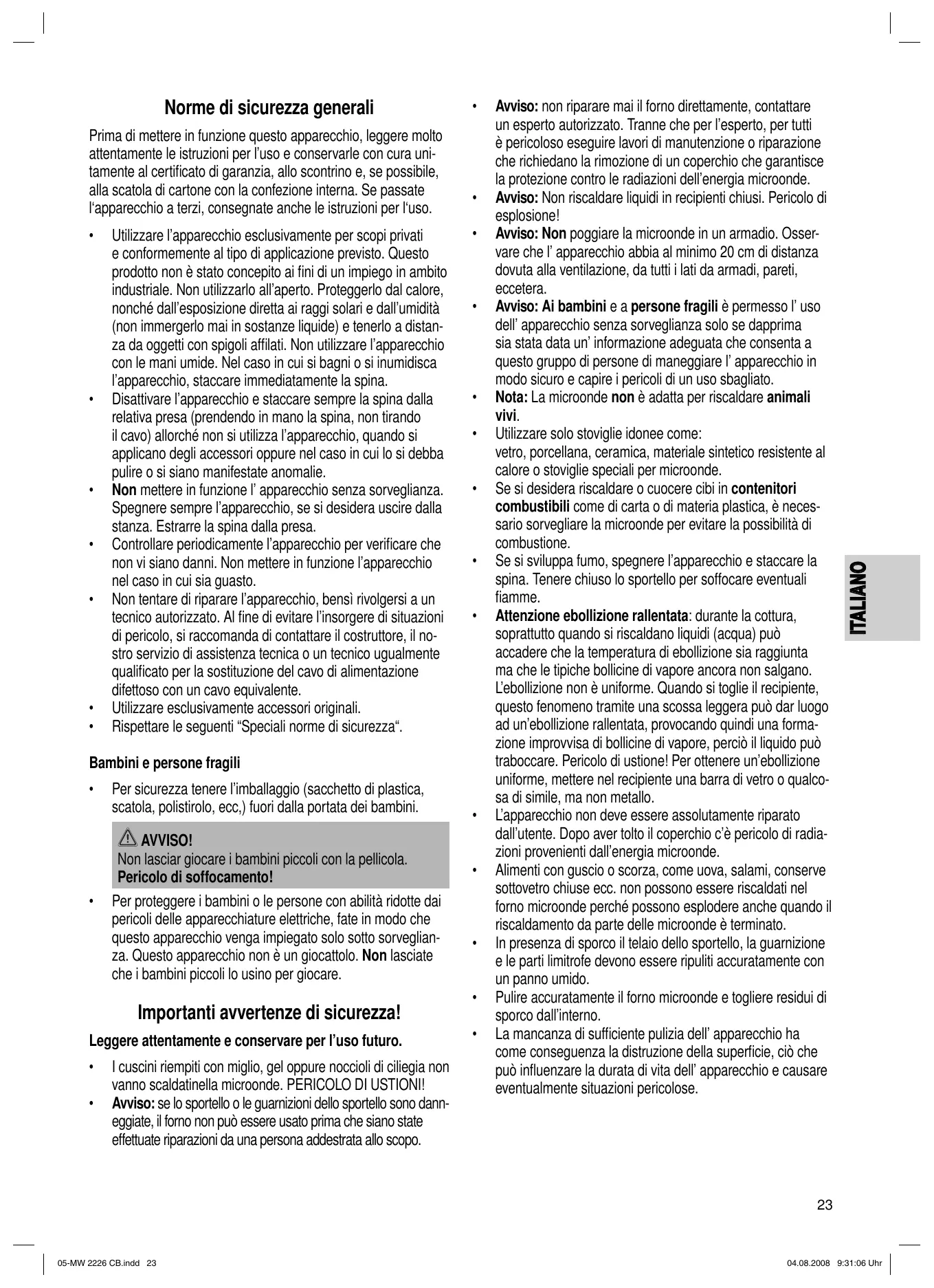 Avviso: non riparare mai il forno direttamente, contattare un esperto autorizzato. Tranne che per l’esperto, per tutti è pericoloso eseguire lavori di manutenzione o riparazione che richiedano la rimozione di un coperchio che garantisce la protezione contro le radiazioni dell’energia microonde. Avviso: Non riscaldare liquidi in recipienti chiusi. Pericolo di esplosione! Avviso: Non poggiare la microonde in un armadio. Osservare che l’ apparecchio abbia al minimo 20 cm di distanza dovuta alla ventilazione, da tutti i lati da armadi, pareti, eccetera. Avviso: Ai bambini e a persone fragili è permesso l’ uso dell’ apparecchio senza sorveglianza solo se dapprima sia stata data un’ informazione adeguata che consenta a questo gruppo di persone di maneggiare l’ apparecchio in modo sicuro e capire i pericoli di un uso sbagliato. Nota: La microonde non è adatta per riscaldare animali vivi. Utilizzare solo stoviglie idonee come: vetro, porcellana, ceramica, materiale sintetico resistente al calore o stoviglie speciali per microonde. Se si desidera riscaldare o cuocere cibi in contenitori combustibili come di carta o di materia plastica, è necessario sorvegliare la microonde per evitare la possibilità di combustione. Se si sviluppa fumo, spegnere l’apparecchio e staccare la spina. Tenere chiuso lo sportello per soffocare eventuali fiamme. Attenzione ebollizione rallentata: durante la cottura, soprattutto quando si riscaldano liquidi (acqua) può accadere che la temperatura di ebollizione sia raggiunta ma che le tipiche bollicine di vapore ancora non salgano. L’ebollizione non è uniforme. Quando si toglie il recipiente, questo fenomeno tramite una scossa leggera può dar luogo ad un’ebollizione rallentata, provocando quindi una formazione improvvisa di bollicine di vapore, perciò il liquido può traboccare. Pericolo di ustione! Per ottenere un’ebollizione uniforme, mettere nel recipiente una barra di vetro o qualcosa di simile, ma non metallo. L’apparecchio non deve essere assolutamente riparato dall’utente. Dopo aver tolto il coperchio c’è pericolo di radiazioni provenienti dall’energia microonde. Alimenti con guscio o scorza, come uova, salami, conserve sottovetro chiuse ecc. non possono essere riscaldati nel forno microonde perché possono esplodere anche quando il riscaldamento da parte delle microonde è terminato. In presenza di sporco il telaio dello sportello, la guarnizione e le parti limitrofe devono essere ripuliti accuratamente con un panno umido. Pulire accuratamente il forno microonde e togliere residui di sporco dall’interno. La mancanza di sufficiente pulizia dell’ apparecchio ha come conseguenza la distruzione della superficie, ciò che può influenzare la durata di vita dell’ apparecchio e causare eventualmente situazioni pericolose. ITALIANO Norme di sicurezza generali