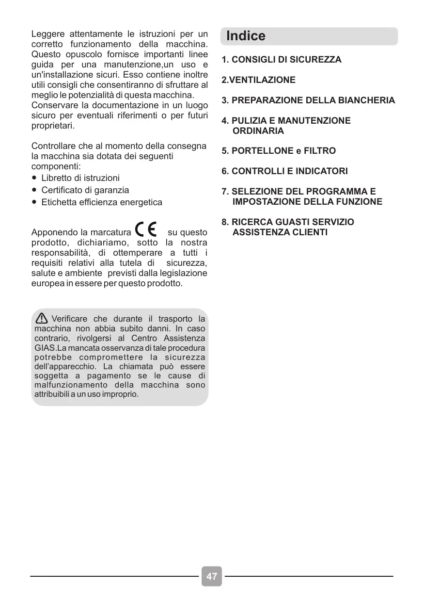 Non installare il prodotto in luoghi freddi o dove visia il rischio di formazione di ghiaccio. Alla temperatura di congelamento dell'acqua il prodotto potrebbe non funzionare correttamente. Se l'acqua del circuito idraulico ghiaccia sono possibili danni a componenti quali: valvole, pompe, tubi. Per garantire le prestazioni del prodotto la temperatura della stanza deve essere compresa tra +2°C e +35°C. Nel caso l'asciugatrice venga utilizzata in ambienti con basse temperature (tra +2°C e +15°C) è possibile che capitino fenomeni di condensazione e di piccole perdite d'acqua sul pavimento. ● Tutti i materiali utilizzati per l’imballaggio sono ecologici e riciclabili. Smaltite l’imballaggio con metodi ecologici. Presso il comune di residenza si potranno reperire ulteriori informazioni sui metodi di smaltimento. ● Per garantire la sicurezza al momento dello smaltimento di una asciugatrice, scollegare la spina dell’alimentazione dalla presa, tagliare il cavo dell’alimentazione di rete e distruggerlo insieme alla spina. Per evitare che i bambini possano rimanere intrappolati all'interno della lavatrice, rompere i cardini o la chiusura dell’oblò. Direttiva Europea 2012/19/EU Questo elettrodomestico è marcato conformemente alla Direttiva Europea 2012/19/EU sui Rifiuti da Apparecchiature Elettriche ed Elettroniche (RAEE). I RAEE contengono sia sostanze inquinanti (che possono cioè avere un impatto negativo anche molto pesante sull'ambiente) sia materie prime (che possono essere riutilizzate). E' perciò necessario sottoporre i RAEE ad apposite operazioni di trattamento, per rimuovere e smaltire in modo sicuro le sostanze inquinanti ed estrarre e riciclare le materie prime. Ogni cittadino può giocare un ruolo decisivo nell'assicurare che i RAEE non diventino un problema ambientale; basta seguire qualche semplice regola: - i RAEE non vanno mai buttati nella spazzatura indifferenziata. - i RAEE devono essere consegnati ai Centri di Raccolta (chiamati anche isole ecologiche, riciclerie, piattaforme ecologiche …) allestiti dai Comuni o dalle Società di igiene urbana; in molte località viene anche effettuato il servizio di ritiro a domicilio dei RAEE ingombranti. In molte nazioni, quando si acquista una nuova apparecchiatura, si può consegnare il RAEE al negoziante, che è tenuto a ritirarlo gratuitamente (ritiro "uno contro uno") a patto che il nuovo apparecchio sia dello stesso tipo e svolga le stesse funzioni di quello reso. GIAS Service Ai fini della durata e del buon funzionamento della macchina, per gli eventuali interventi di assistenza o riparazione consigliamo di rivolgersi esclusivamente al servizio assistenza autorizzato GIAS.