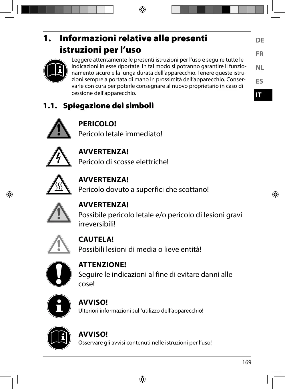 Leggere attentamente le presenti istruzioni per l’uso e seguire tutte le indicazioni in esse riportate. In tal modo si potranno garantire il funzionamento sicuro e la lunga durata dell’apparecchio. Tenere queste istruzioni sempre a portata di mano in prossimità dell’apparecchio. Conservarle con cura per poterle consegnare al nuovo proprietario in caso di cessione dell’apparecchio. 1.1. Spiegazione dei simboli PERICOLO! Pericolo letale immediato! AVVERTENZA! Pericolo di scosse elettriche! AVVERTENZA! Pericolo dovuto a superfici che scottano! AVVERTENZA! Possibile pericolo letale e/o pericolo di lesioni gravi irreversibili! CAUTELA! Possibili lesioni di media o lieve entità! ATTENZIONE! Seguire le indicazioni al fine di evitare danni alle cose! AVVISO! Ulteriori informazioni sull’utilizzo dell’apparecchio! AVVISO! Osservare gli avvisi contenuti nelle istruzioni per l’uso!