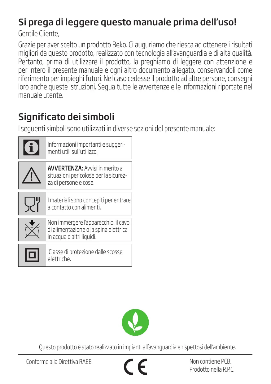 Informazioni importanti e suggerimenti utili sull'utilizzo. AVVERTENZA: Avvisi in merito a situazioni pericolose per la sicurezza di persone e cose. I materiali sono concepiti per entrare a contatto con alimenti. Non immergere l'apparecchio, il cavo di alimentazione o la spina elettrica in acqua o altri liquidi. Classe di protezione dalle scosse elettriche. Questo prodotto è stato realizzato in impianti all’avanguardia e rispettosi dell’ambiente. Conforme alla Direttiva RAEE. Non contiene PCB. Prodotto nella R.P.C. 1 I struzioni importanti per la sicurezza el'ambiente Leggere questo manuale di istruzioni completamente prima di usare questo apparecchio! Seguire tutte le istruzioni di sicurezza per evitare danni dovuti all'uso non corretto! Conservare il manuale di istruzioni per riferimento futuro. Se questo apparecchio viene dato a terzi, bisogna consegnare anche questo manuale di istruzioni.