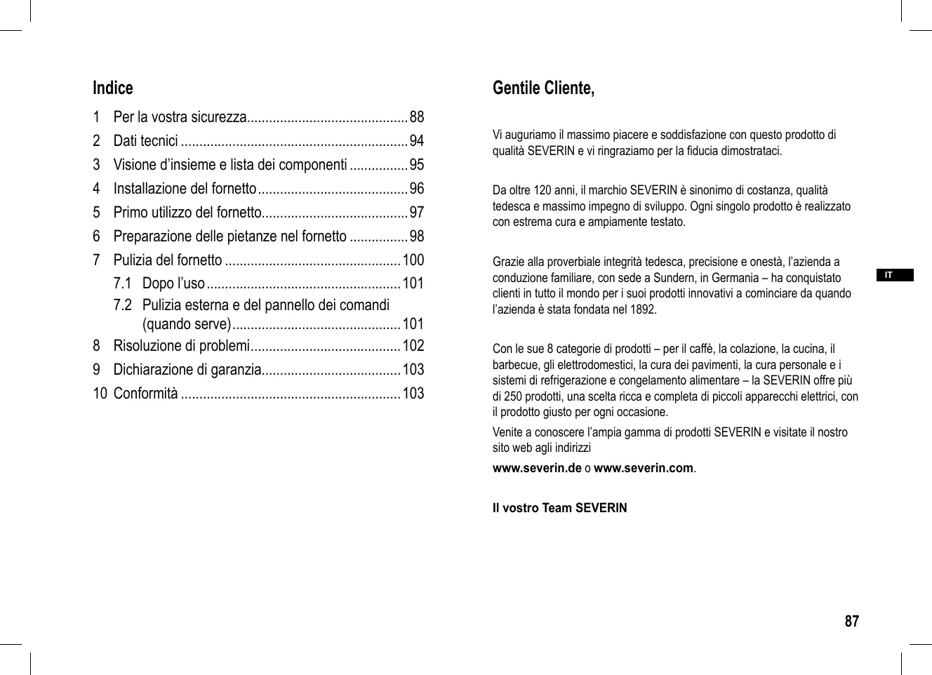 • Il fornetto non contiene nessun componente su cui potete fare manutenzione o riparazioni da soli. Le riparazioni devono essere apportate dal Centro Assistenza della SEVERIN.