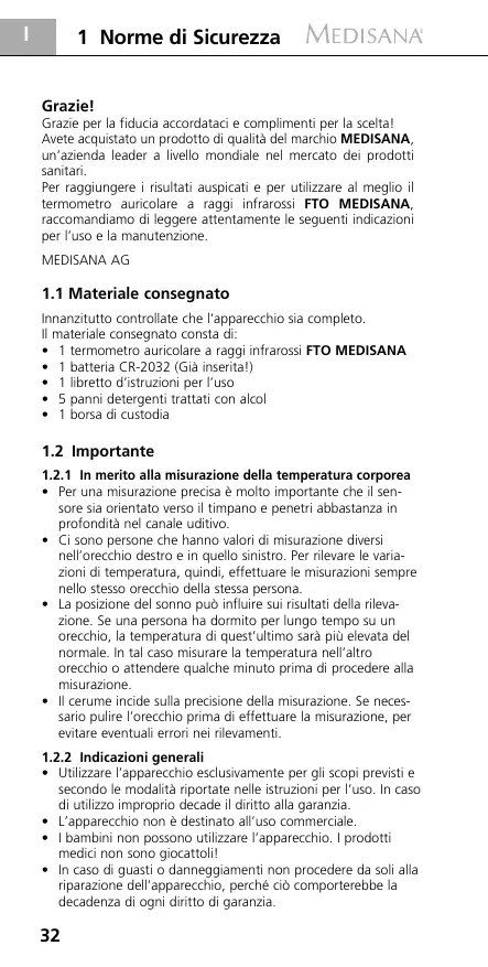 Per raggiungere i risultati auspicati e perutilizzare al meglio il termometro auricolare a raggi infrarossi FTO MEDISANA, raccommandiamo di leggere attentamente le seguentiindicazioni per l'uso e la manutenzione.