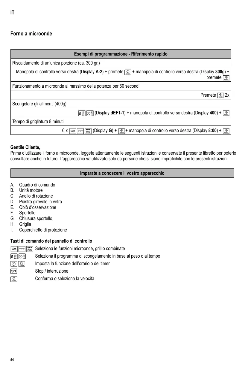 Quadro di comando Unità motore Anello di rotazione Piastra girevole in vetro Oblò d’osservazione Sportello Chiusura sportello Griglia Coperchietto di protezione Tasti di comando del pannello di controllo Seleziona le funzioni microonde, grill o combinate Seleziona il programma di scongelamento in base al peso o al tempo Imposta la funzione dell’orario o del timer Stop / interruzione Conferma o seleziona la velocità