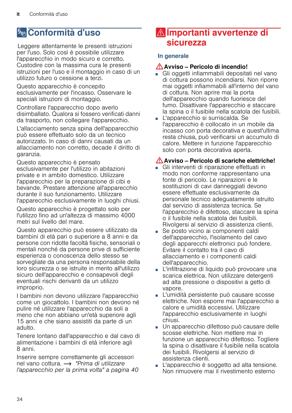 (Importanti avvertenze di sicurezza I mpor t ant i av er t enze di si cur ez a In generale : Avviso – Pericolo di incendio! Gli oggetti infiammabili depositati nel vano di cottura possono incendiarsi. Non riporre mai oggetti infiammabili all'interno del vano di cottura. Non aprire mai la porta dell'apparecchio quando fuoriesce del fumo. Disattivare l'apparecchio e staccare la spina o il fusibile nella scatola dei fusibili. Pericolo di incendio!si surriscalda. Se L'apparecchio l'apparecchio è collocato in un mobile da incasso con porta decorativa e quest'ultima resta chiusa, può verificarsi un accumulo di calore. Mettere in funzione l'apparecchio solo con porta decorativa aperta.
