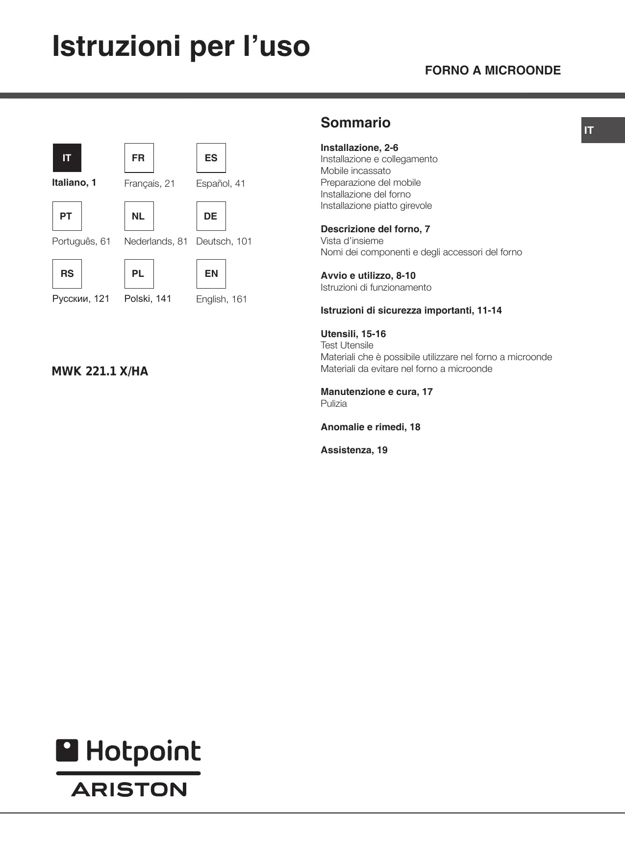 Trova gratuitamente il manuale del dispositivo MWK211KHA HOTPOINT in formato PDF.