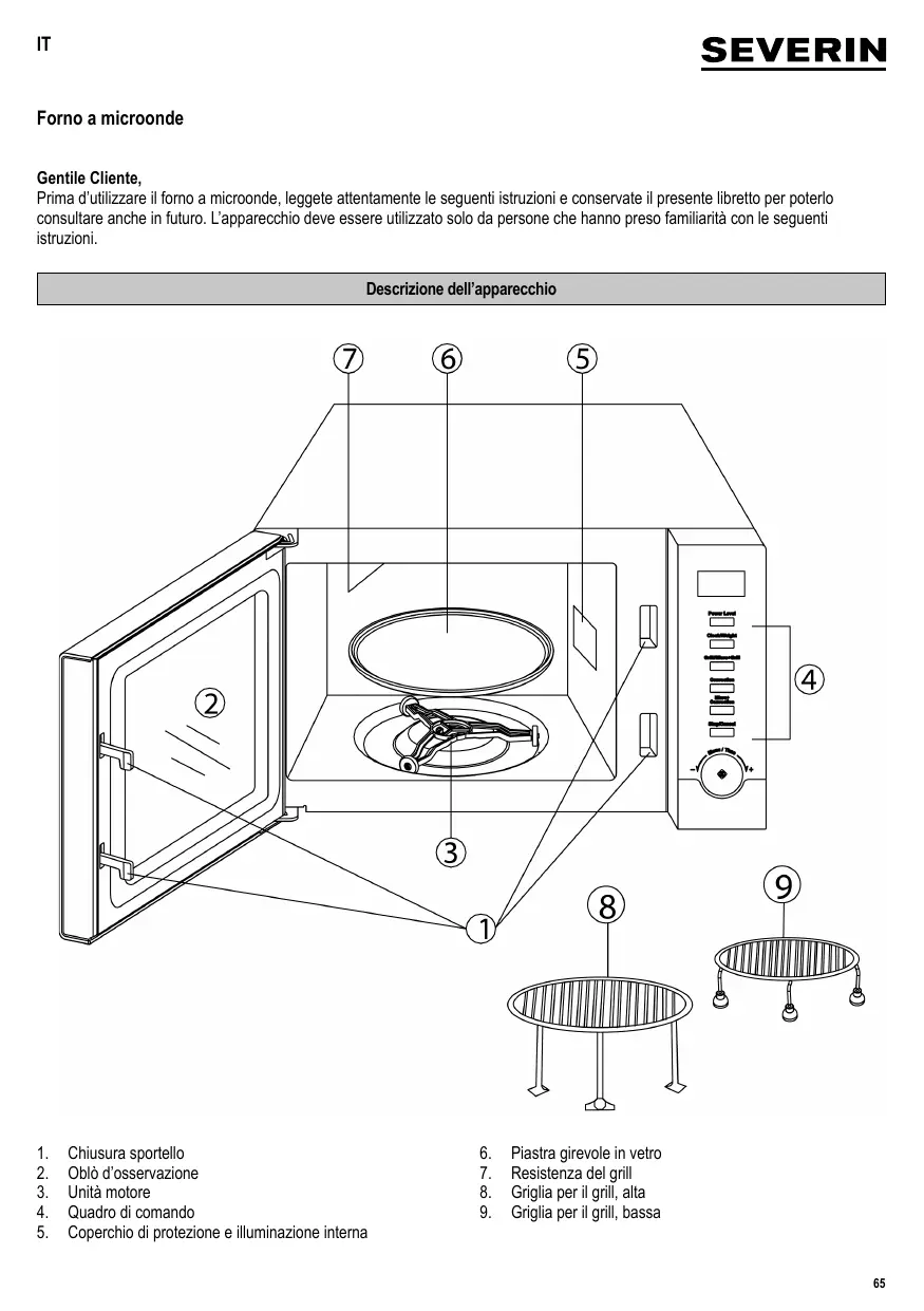 Forno a microonde Gentile Cliente, Prima d’utilizzare il forno a microonde, leggete attentamente le seguenti istruzioni e conservate il presente libretto per poterlo consultare anche in futuro. L’apparecchio deve essere utilizzato solo da persone che hanno preso familiarità con le seguenti istruzioni. Descrizione dell’apparecchio