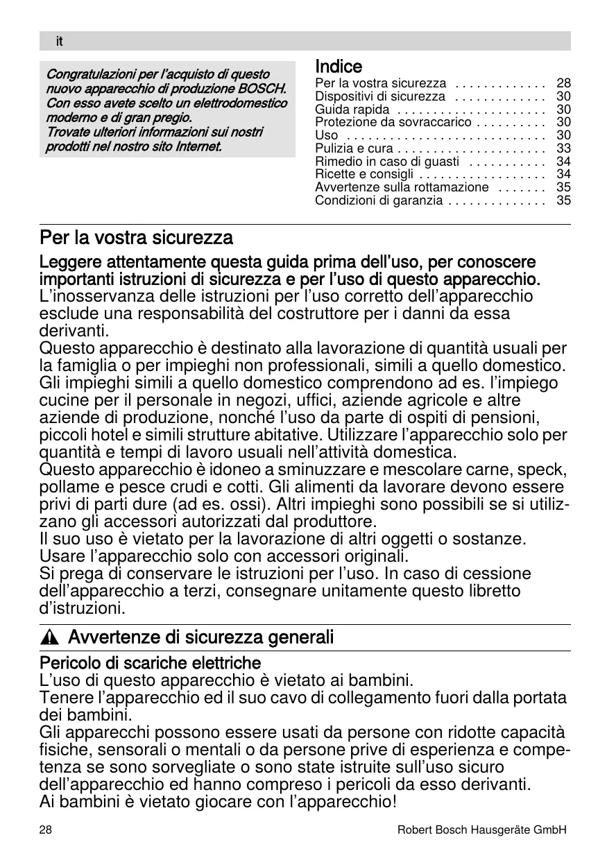Congratulazioni per l’acquisto di questo nuovo apparecchio di produzione BOSCH. Con esso avete scelto un elettrodomestico moderno e di gran pregio. Trovate ulteriori informazioni sui nostri prodotti nel nostro sito Internet. Indice Per la vostra sicurezza ... Dispositivi di sicurezza ... Guida rapida ... Protezione da sovraccarico ... Uso ... Pulizia e cura ... Rimedio in caso di guasti ... Ricette e consigli ... Avvertenze sulla rottamazione ... Condizioni di garanzia ...