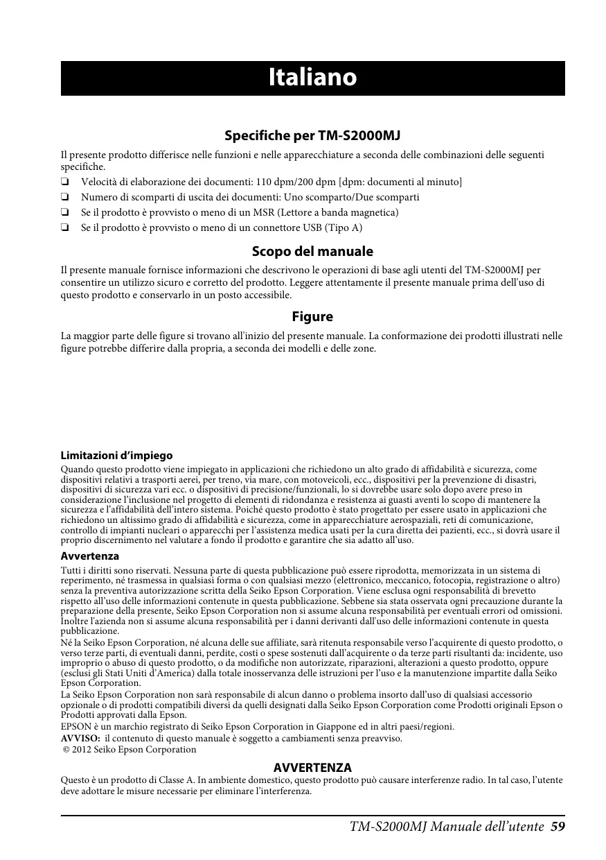 Scopo del manuale Il presente manuale fornisce informazioni che descrivono le operazioni di base agli utenti del TM-S2000MJ per consentire un utilizzo sicuro e corretto del prodotto. Leggere attentamente il presente manuale prima dell'uso di questo prodotto e conservarlo in un posto accessibile.