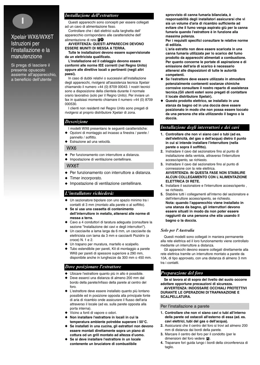 ESSERE MUNITI DI MESSA A TERRA. Tutte le installazioni devono essere supervisionate da un elettricista qualificato. L'installazione ed il cablaggio devono essere conformi alle norme IEE correnti (nel Regno Unito) oppure alle direttive locali o pertinenti (negli altri paesi). In caso di dubbi relativi o successivi all’installazione degli apparecchi, rivolgersi all'assistenza tecnica Xpelair chiamando il numero +44 (0) 8709 00043. I nostri tecnici sono a disposizione della clientela durante il normale orario lavorativo (solo per il Regno Unito). Per inviare un fax in qualsiasi momento chiamare il numero +44 (0) 8709 I clienti non residenti nel Regno Unito sono pregati di rivolgersi al proprio distributore Xpelair di zona. Descrizione I modelli WX6 presentano le seguenti caratteristiche: ◆ Opzioni di montaggio ad incasso a finestra / parete / pannello / soffitto. ◆ Estrazione ad una velocità. WX6 ◆ Per funzionamento con interruttore a distanza. ◆ Impostazione di ventilazione centellinare. WX6T ◆ Per funzionamento con interruttore a distanza. ◆ Timer incorporato. ◆ Impostazione di ventilazione centellinare. L'installatore richiederà: ◆ Un sezionatore bipolare con uno spazio minimo tra i contatti di 3 mm (montato alla parete o al soffitto). ◆ Se si usa una cassetta di contenimento dell’interruttore in metallo, attenersi alle norme di messa a terra. ◆ Cavo a 4 conduttori di taratura adeguata (consultare la sezione "Installazione dei cavi e degli interruttori"). ◆ Un cacciavite a lama larga da 6 mm, un cacciavite da elettricista con lama da 3 mm e cacciaviti Pozidriv (a croce) N. 1 e 2. ◆ Un trapano per muratura, martello e scalpello. ◆ Tubo estendibile per pareti, Kit di montaggio a parete WK6 per pareti di spessore superiore a 290 mm, disponibile anche in lunghezze da 300 mm o 450 mm. sprovvisto di canna fumaria bilanciata, è responsabilità degli installatori assicurarsi che vi sia un volume d'aria di ricambio sufficiente ad evitare che il fumo venga aspirato giù per la canna fumaria quando l'estrattore è in funzione alla massima potenza. Per i requisiti specifici consultare le relative norme di edilizia. L'aria estratta non deve essere scaricata in una canna fumaria utilizzata per lo scarico del fumo prodotto da apparecchi alimentati a combustione. Per quanto concerne le portate di aspirazione e di emissione dell'aria di scarico è necessario attenersi alle disposizioni di tutte le autorità competenti. ◆ Se l'estrattore deve essere utilizzato in atmosfere potenzialmente contenenti sostanze chimiche corrosive consultare il nostro reparto di assistenza tecnica.(Gli utenti esteri sono pregati di contattare il locale distributore Xpelair). ◆ Questo prodotto elettrico, se installato in una stanza da bagno od in una doccia deve essere posizionato in modo che non possa essere toccato da una persona che stia utilizzando il bagno o la doccia. Installazione degli interruttori e dei cavi