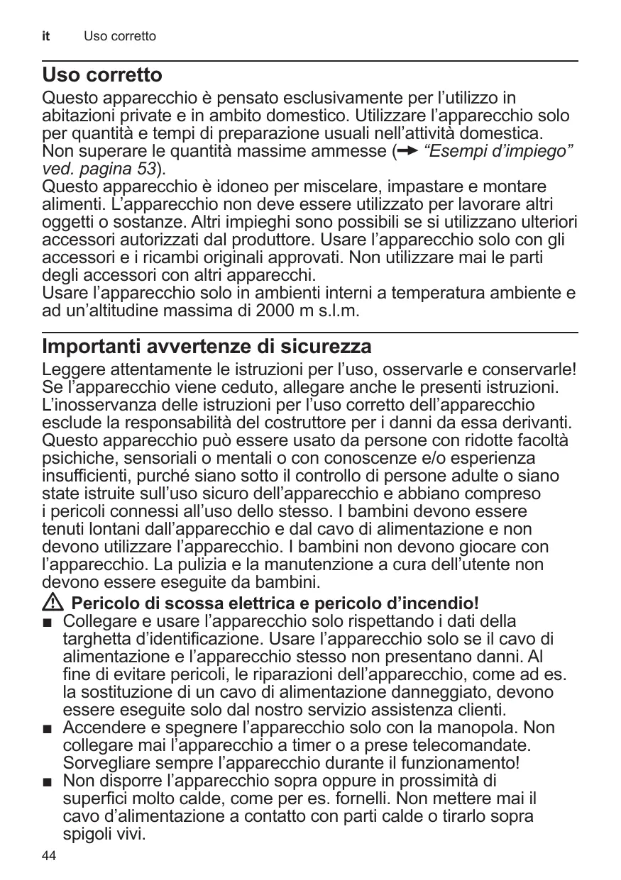 Uso corretto Uso corretto Questo apparecchio è pensato esclusivamente per l’utilizzo in abitazioni private e in ambito domestico. Utilizzare l’apparecchio solo per quantità e tempi di preparazione usuali nell’attività domestica. Non superare le quantità massime ammesse (X “Esempi d’impiego” ved. pagina 53). Questo apparecchio è idoneo per miscelare, impastare e montare alimenti. L’apparecchio non deve essere utilizzato per lavorare altri oggetti o sostanze. Altri impieghi sono possibili se si utilizzano ulteriori accessori autorizzati dal produttore. Usare l’apparecchio solo con gli accessori e i ricambi originali approvati. Non utilizzare mai le parti degli accessori con altri apparecchi. Usare l’apparecchio solo in ambienti interni a temperatura ambiente e ad un’altitudine massima di 2000 m s.l.m. Importanti avvertenze di sicurezza Leggere attentamente le istruzioni per l’uso, osservarle e conservarle! Se l’apparecchio viene ceduto, allegare anche le presenti istruzioni. L’inosservanza delle istruzioni per l’uso corretto dell’apparecchio esclude la responsabilità del costruttore per i danni da essa derivanti. Questo apparecchio può essere usato da persone con ridotte facoltà psichiche, sensoriali o mentali o con conoscenze e/o esperienza insufficienti, purché siano sotto il controllo di persone adulte o siano state istruite sull’uso sicuro dell’apparecchio e abbiano compreso i pericoli connessi all’uso dello stesso. I bambini devono essere tenuti lontani dall’apparecchio e dal cavo di alimentazione e non devono utilizzare l’apparecchio. I bambini non devono giocare con l’apparecchio. La pulizia e la manutenzione a cura dell’utente non devono essere eseguite da bambini. WW Pericolo di scossa elettrica e pericolo d’incendio! ■■ Collegare e usare l’apparecchio solo rispettando i dati della targhetta d’identificazione. Usare l’apparecchio solo se il cavo di alimentazione e l’apparecchio stesso non presentano danni. Al fine di evitare pericoli, le riparazioni dell’apparecchio, come ad es. la sostituzione di un cavo di alimentazione danneggiato, devono essere eseguite solo dal nostro servizio assistenza clienti. ■■ Accendere e spegnere l’apparecchio solo con la manopola. Non collegare mai l’apparecchio a timer o a prese telecomandate. Sorvegliare sempre l’apparecchio durante il funzionamento! ■■ Non disporre l’apparecchio sopra oppure in prossimità di superfici molto calde, come per es. fornelli. Non mettere mai il cavo d’alimentazione a contatto con parti calde o tirarlo sopra spigoli vivi.