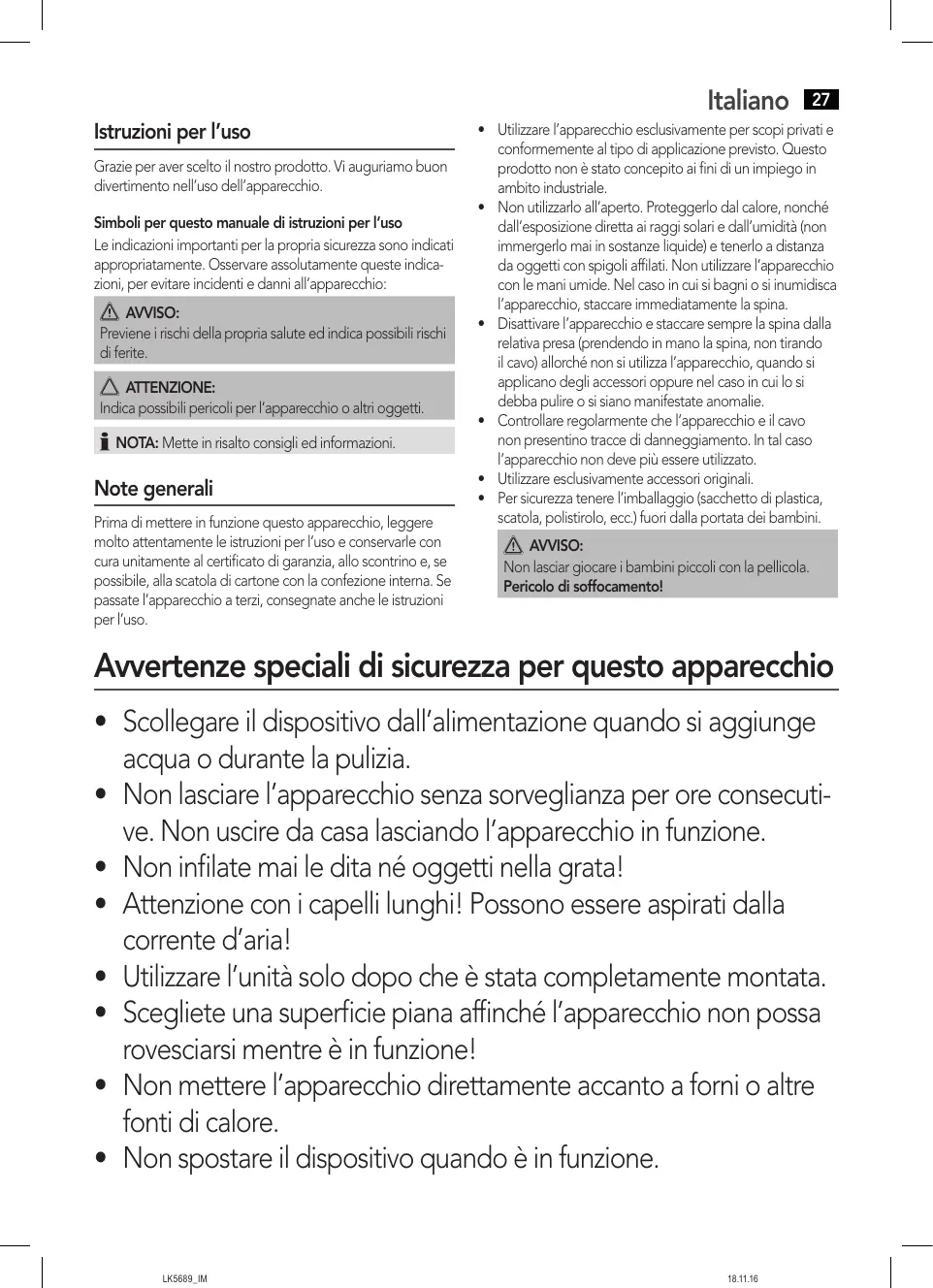 - Non utilizzato all'aperto. Proteggerlo dal calore, nonché dall'esposizione diretta ai raggi solari e dall'umidità (non immergerlo mai in sostanze liquide) e tenerlo a distance da oggetti con spigoli affiliati. Non utilizzato l'apparecchio con le mani umide. Nel caso in cui si bagni o si inumidisce l'apparecchio, staccare immediatamente la spina.