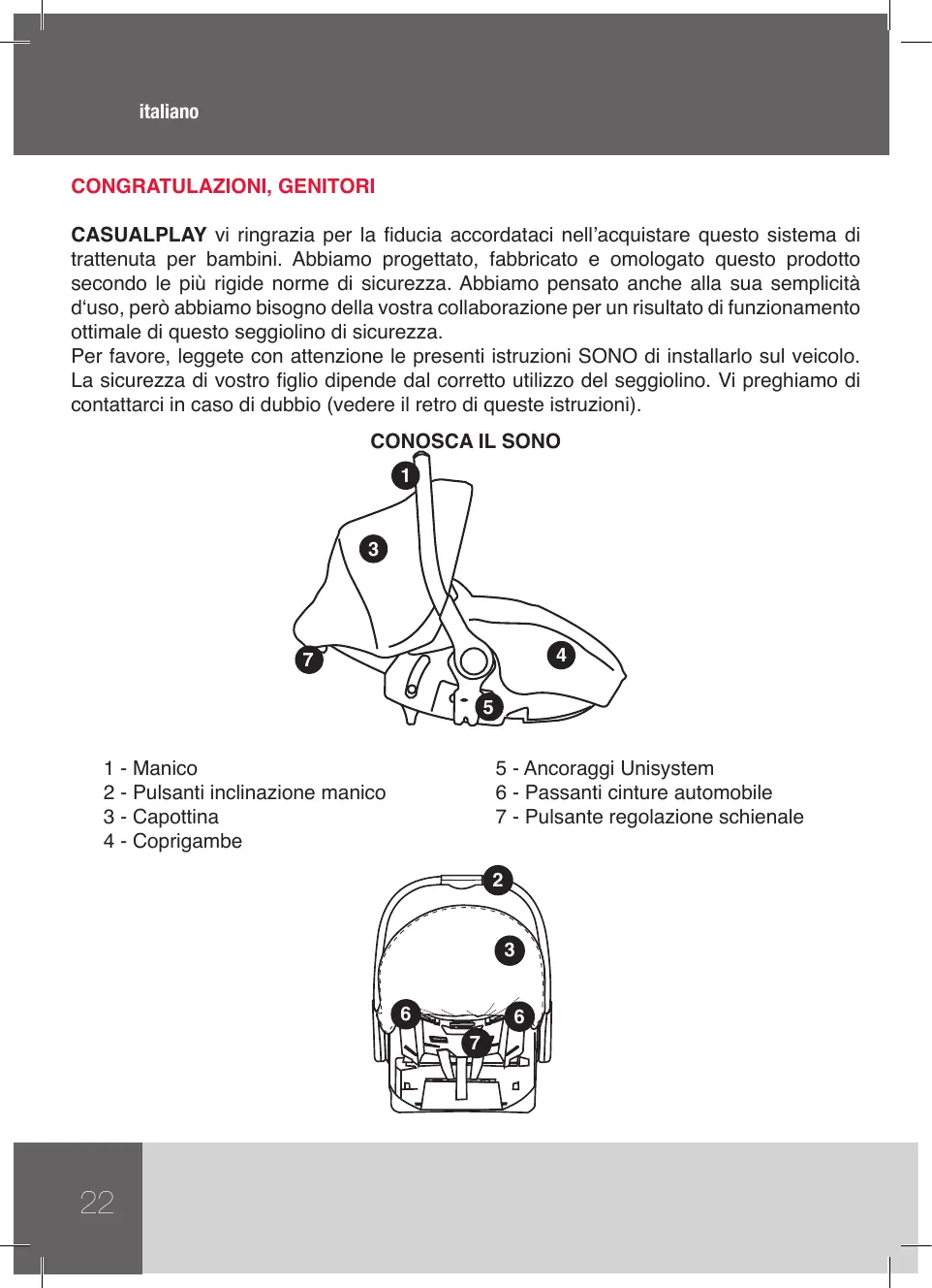 italiano CONGRATULAZIONI, GENITORI CASUALPLAY vi ringrazia per la fiducia accordataci nell’acquistare questo sistema di trattenuta per bambini. Abbiamo progettato, fabbricato e omologato questo prodotto secondo le più rigide norme di sicurezza. Abbiamo pensato anche alla sua semplicità d‘uso, però abbiamo bisogno della vostra collaborazione per un risultato di funzionamento ottimale di questo seggiolino di sicurezza. Per favore, leggete con attenzione le presenti istruzioni SONO di installarlo sul veicolo. La sicurezza di vostro figlio dipende dal corretto utilizzo del seggiolino. Vi preghiamo di contattarci in caso di dubbio (vedere il retro di queste istruzioni). CONOSCA IL SONO 1 3