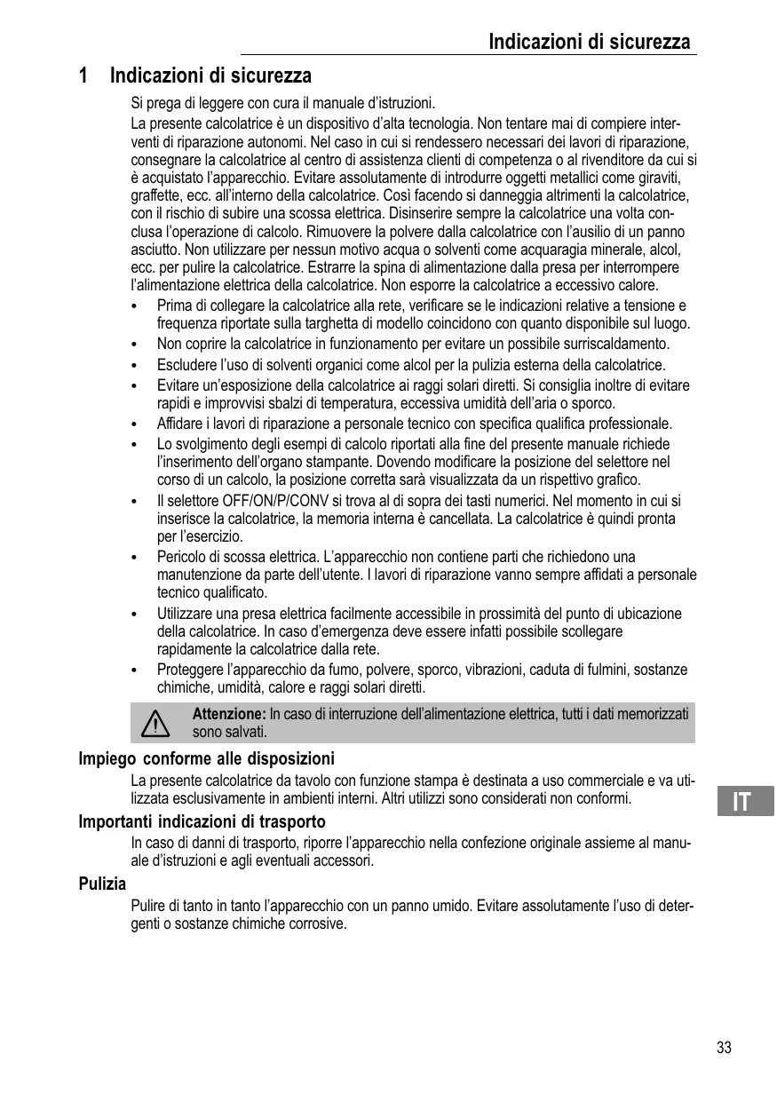 Votre calculatrice est un appareil sophistiqué. Veuillez ne jamais tenter de le réparer. Si des réparations étaient nécessaires, apportez votre calculatrice à votre service après−vente autorisé le plus près ou à votre revendeur. N’introduisez en aucun cas des objets métalliques tels que tournevis, trombones etc. dans votre calculatrice. Vous pouvez l’endommager et vous risquez un choc électrique. Éteignez toujours la calculatrice après avoir effectué vos opérations. Essuyez doucement la calculatrice à l’aide d’un chiffon sec. N’utilisez jamais d’eau ou de solvant tel que diluant pour vernis pour nettoyer votre calculatrice. Retirez la fiche de la prise de courant pour couper totalement la calculatrice du réseau électrique. N’exposez pas la calculatrice à une trop grande chaleur. Avant de raccorder la calculatrice au réseau, vérifiez si les données de tension et de fréquence de la plaque signalétique correspondent à celles du réseau local. Ne couvrez pas la calculatrice lorsqu’elle est branchée ; cela peut provoquer une surchauffe. Pour nettoyer l’extérieur de votre calculatrice, n’utilisez pas de diluants organiques tel que l’alcool. N’exposez pas votre calculatrice à un ensoleillement direct. Évitez également les changements rapides de température, une humidité de l’air élevée ou la poussière. Faites effectuer les réparations uniquement par un technicien qualifié ayant été formé à cet effet. Pour utiliser les exemples se trouvant en fin de ce mode d’emploi, veuillez brancher le groupe d’impression. Dans la mesure où la position de l’interrupteur doit être modifiée pendant un calcul, la position correcte est affichée dans un dessin. L’interrupteur OFF/ON/P/CONV se trouve au−dessus des touches numériques. Lorsque vous allumez votre calculatrice, la mémoire interne est effacée. La calculatrice est désormais prête à fonctionner. Risque de choc électrique. La calculatrice contient des pièces ne devant pas être réparées par l’utilisateur. Seuls des techniciens qualifiés sont autorisés à effectuer des réparations. La prise de courant doit se trouver à proximité de l’appareil et facilement accessible. En cas d’urgence, il vous sera possible de retirer rapidement la fiche de celle−ci pour couper l’appareil du réseau. Protéger l’appareil contre la fumée, la poussière, les vibrations, les chocs, les substances chimiques, l’humidité, la chaleur et un ensoleillement direct. Attention : Les données mémorisées sont conservées, même lors d’une coupure de courant.