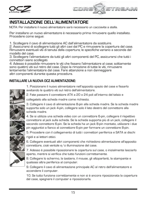 sono quattro viti sul retro del case. Dopo la rimozione di tutte le viti, rimuovere lentamente l’alimentatore dal case. Fare attenzione a non danneggiare altri componenti durante questa procedura. INSTALLARE LA NUOVA OCZ ALIMENTAZIONE: