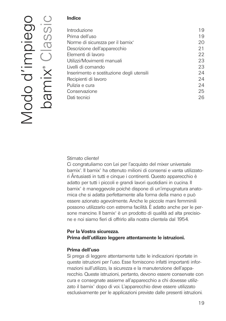 Stimato cliente! Ci congratuliamo con Lei per l’acquisto del mixer universale bamix . Il bamix ha ottenuto milioni di consensi e vanta utilizzatori Ântusiasti in tutti e cinque i continenti. Questo apparecchio è adatto per tutti i piccoli e grandi lavori quotidiani in cucina. Il bamix è maneggevole poiché dispone di un’impugnatura anatomica che si adatta perfettamente alla forma della mano e può essere azionato agevolmente. Anche le piccole mani femminili possono utilizzarlo con estrema facilità. È adatto anche per le persone mancine. Il bamix è un prodotto di qualità ad alta precisione e noi siamo fieri di offrirlo alla nostra clientela dal 1954.