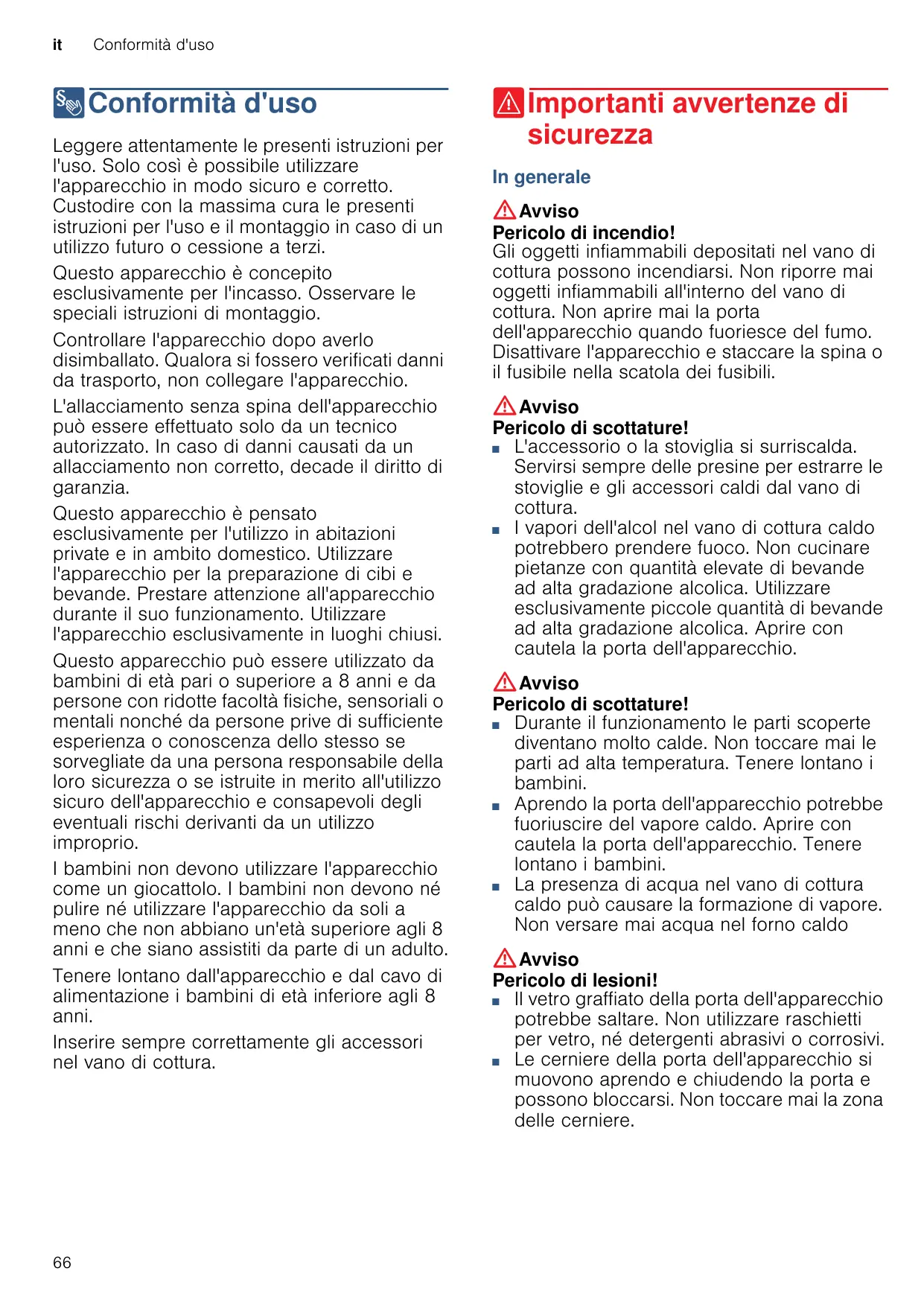 (Importanti avvertenze di sicurezza In generale az eruc i s i d ezne t rev a i t na t ropmI : Avviso Pericolo di incendio! Gli oggetti infiammabili depositati nel vano di cottura possono incendiarsi. Non riporre mai oggetti infiammabili all'interno del vano di cottura. Non aprire mai la porta dell'apparecchio quando fuoriesce del fumo. Disattivare l'apparecchio e staccare la spina o il fusibile nella scatola dei fusibili. : Avviso Pericolo di scottature! L'accessorio o la stoviglia si surriscalda. Servirsi sempre delle presine per estrarre le stoviglie e gli accessori caldi dal vano di cottura. Pericolo di scottature! I vapori dell'alcol nel vano di cottura caldo potrebbero prendere fuoco. Non cucinare pietanze con quantità elevate di bevande ad alta gradazione alcolica. Utilizzare esclusivamente piccole quantità di bevande ad alta gradazione alcolica. Aprire con cautela la porta dell'apparecchio. : Avviso Pericolo di scottature! Durante il funzionamento le parti scoperte diventano molto calde. Non toccare mai le parti ad alta temperatura. Tenere lontano i bambini. Pericolo di bruciature! Aprendo la porta dell'apparecchio potrebbe fuoriuscire del vapore caldo. Aprire con cautela la porta dell'apparecchio. Tenere lontano i bambini. Pericolo di bruciature! La presenza di acqua nel vano di cottura caldo può causare la formazione di vapore. Non versare mai acqua nel forno caldo : Avviso Pericolo di lesioni! Il vetro graffiato della porta dell'apparecchio potrebbe saltare. Non utilizzare raschietti per vetro, né detergenti abrasivi o corrosivi. Pericolo di lesioni! Le cerniere della porta dell'apparecchio si muovono aprendo e chiudendo la porta e possono bloccarsi. Non toccare mai la zona delle cerniere. Importanti avvertenze di sicurezza : Avviso Pericolo di scariche elettriche! Gli interventi di riparazione effettuati in modo non conforme rappresentano una fonte di pericolo. Le riparazioni e le sostituzioni di cavi danneggiati devono essere effettuate esclusivamente da personale tecnico adeguatamente istruito dal servizio di assistenza tecnica. Se l'apparecchio è difettoso, staccare la spina o il fusibile nella scatola dei fusibili. Rivolgersi al servizio di assistenza clienti. Pericolo di scariche Se posto vicinoelettriche! ai componenti caldi dell'apparecchio, l'isolamento del cavo degli apparecchi elettronici può fondere. Evitare il contatto tra il cavo di allacciamento e i componenti caldi dell'apparecchio. Pericolo di scariche L'infiltrazione dielettriche! liquido può provocare una scarica elettrica. Non utilizzare detergenti ad alta pressione o dispositivi a getto di vapore. Pericolo di scariche elettriche! Un apparecchio difettoso può causare delle scosse elettriche. Non mettere mai in funzione un apparecchio difettoso. Togliere la spina o disattivare il fusibile nella scatola dei fusibili. Rivolgersi al servizio di assistenza clienti. : Avviso Pericoli dovuti ai campi magnetici! Nel pannello di comando o negli elementi di comando sono inseriti magneti permanenti. Questi possono agire sugli impianti elettronici, quali ad es. pacemaker o pompe di insulina. I portatori di impianti elettronici devono mantenersi a una distanza minima di 10 cm dal pannello di comando.