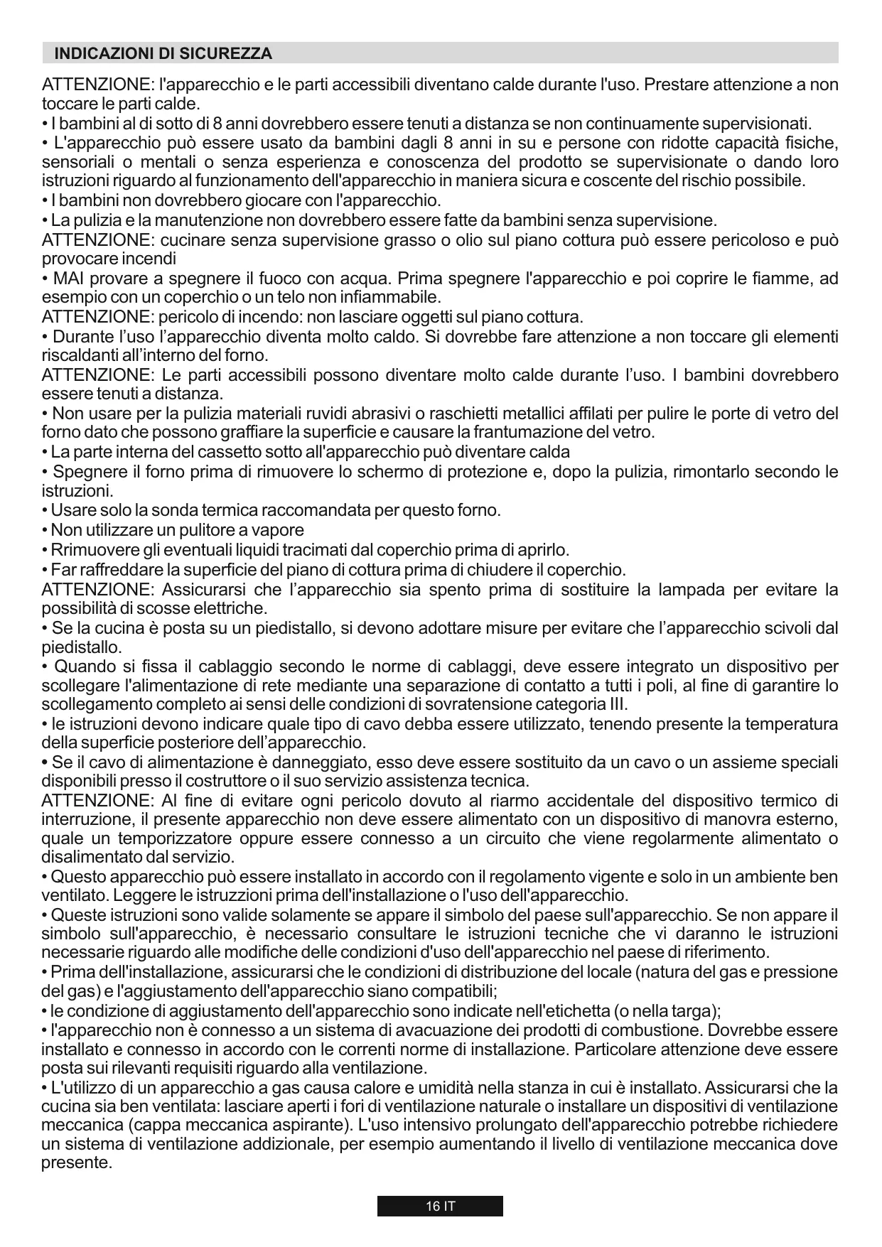 - L'utilizzo di un apparecchio a gas causa calore e umidità nella stanza in cui è installato. Assicurarsi che la cucina sia ben ventilata: lasciare aperti i fori di ventilazione naturale o installare un dispositivi di ventilazione meccanica (cappa meccanica aspirante). L'uso intensivo prolungato dell'apparecchio potrebbe richiedere un sistema di ventilazione addizionale, per esempio aumentando il livello di ventilazione meccanica dove presente. 16 IT ATTENZIONE: Le parti accessibili possono diventare calde quando il grill è in uso. I bambini dovrebbero essere tenuti a distanza.