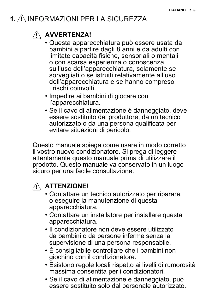 - Se il cavo di alimentazione è danneggiato, deve essere sostituito dal produttore, da un tecnico autorizzato o da una persona qualificata per evitare situazioni di pericolo. Questo manuale spiega come usare in modo corretto il vostro nuovo condizionatore. Si prega di leggere attentamente questo manuale prima di utilizzare il prodotto. Questo manuale va conservato in un luogo sicuro per una facile consultazione. ATTENZIONE!
