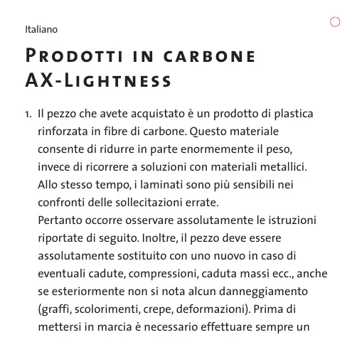 rinforzata in fibre di carbone. Questo materiale consente di ridurre in parte enormemente il peso, invece di ricorrere a soluzioni con materiali metallici. Allo stesso tempo, i laminati sono più sensibili nei confronti delle sollecitazioni errate. Pertanto occorre osservare assolutamente le istruzioni riportate di seguito. Inoltre, il pezzo deve essere assolutamente sostituito con uno nuovo in caso di eventuali cadute, compressioni, caduta massi ecc., anche se esteriormente non si nota alcun danneggiamento (graffi, scolorimenti, crepe, deformazioni). Prima di mettersi in marcia è necessario effettuare sempre un controllo visivo del pezzo per accertarsi che non ci siano graffi, scolorimenti, crepe, deformazioni. Inoltre si deve controllare se il pezzo è stato montato secondo le relative istruzioni di montaggio. Prima di mettersi in marcia occorre controllare sempre che i vari componenti siano ben fissati.