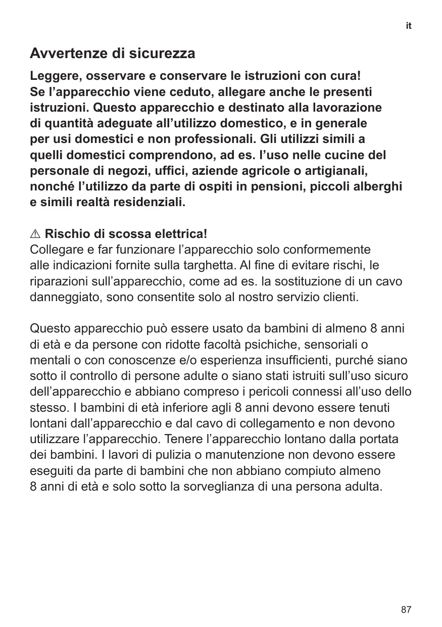 Avvertenze di sicurezza Leggere, osservare e conservare le istruzioni con cura! Se l’apparecchio viene ceduto, allegare anche le presenti istruzioni. Questo apparecchio e destinato alla lavorazione di quantità adeguate all’utilizzo domestico, e in generale per usi domestici e non professionali. Gli utilizzi simili a quelli domestici comprendono, ad es. l’uso nelle cucine del personale di negozi, uffici, aziende agricole o artigianali, nonché l’utilizzo da parte di ospiti in pensioni, piccoli alberghi e simili realtà residenziali. ¡ Rischio di scossa elettrica! Collegare e far funzionare l’apparecchio solo conformemente alle indicazioni fornite sulla targhetta. Al fine di evitare rischi, le riparazioni sull’apparecchio, come ad es. la sostituzione di un cavo danneggiato, sono consentite solo al nostro servizio clienti. Questo apparecchio può essere usato da bambini di almeno 8 anni di età e da persone con ridotte facoltà psichiche, sensoriali o mentali o con conoscenze e/o esperienza insufficienti, purché siano sotto il controllo di persone adulte o siano stati istruiti sull’uso sicuro dell’apparecchio e abbiano compreso i pericoli connessi all’uso dello stesso. I bambini di età inferiore agli 8 anni devono essere tenuti lontani dall’apparecchio e dal cavo di collegamento e non devono utilizzare l’apparecchio. Tenere l’apparecchio lontano dalla portata dei bambini. I lavori di pulizia o manutenzione non devono essere eseguiti da parte di bambini che non abbiano compiuto almeno 8 anni di età e solo sotto la sorveglianza di una persona adulta.