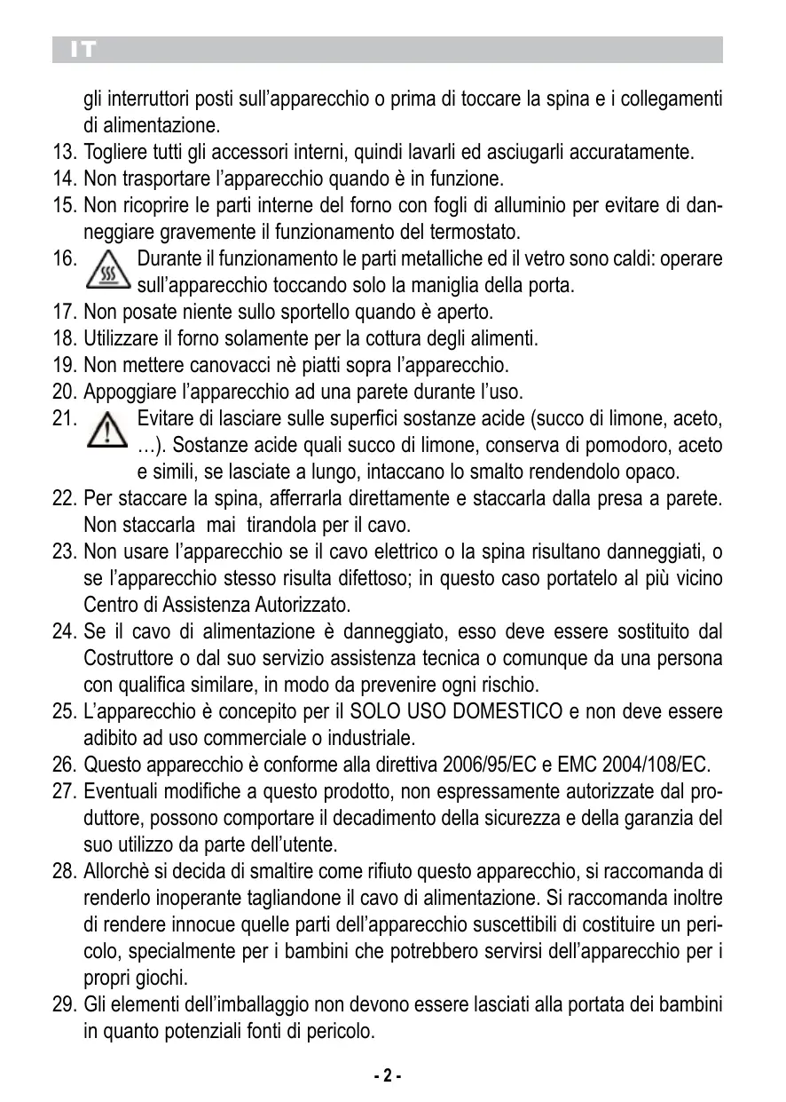 IT gli interruttori posti sull’apparecchio o prima di toccare la spina e i collegamenti di alimentazione. 13. Togliere tutti gli accessori interni, quindi lavarli ed asciugarli accuratamente. 14. Non trasportare l’apparecchio quando è in funzione. 15. Non ricoprire le parti interne del forno con fogli di alluminio per evitare di danneggiare gravemente il funzionamento del termostato. 16. Durante il funzionamento le parti metalliche ed il vetro sono caldi: operare sull’apparecchio toccando solo la maniglia della porta. 17. Non posate niente sullo sportello quando è aperto. 18. Utilizzare il forno solamente per la cottura degli alimenti. 19. Non mettere canovacci nè piatti sopra l’apparecchio. 20. Appoggiare l’apparecchio ad una parete durante l’uso. 21. Evitare di lasciare sulle superfici sostanze acide (succo di limone, aceto, …). Sostanze acide quali succo di limone, conserva di pomodoro, aceto e simili, se lasciate a lungo, intaccano lo smalto rendendolo opaco. 22. Per staccare la spina, afferrarla direttamente e staccarla dalla presa a parete. Non staccarla mai tirandola per il cavo. 23. Non usare l’apparecchio se il cavo elettrico o la spina risultano danneggiati, o se l’apparecchio stesso risulta difettoso; in questo caso portatelo al più vicino Centro di Assistenza Autorizzato. 24. Se il cavo di alimentazione è danneggiato, esso deve essere sostituito dal Costruttore o dal suo servizio assistenza tecnica o comunque da una persona con qualifica similare, in modo da prevenire ogni rischio. 25. L’apparecchio è concepito per il SOLO USO DOMESTICO e non deve essere adibito ad uso commerciale o industriale. 26. Questo apparecchio è conforme alla direttiva 2006/95/EC e EMC 2004/108/EC. 27. Eventuali modifiche a questo prodotto, non espressamente autorizzate dal produttore, possono comportare il decadimento della sicurezza e della garanzia del suo utilizzo da parte dell’utente. 28. Allorchè si decida di smaltire come rifiuto questo apparecchio, si raccomanda di renderlo inoperante tagliandone il cavo di alimentazione. Si raccomanda inoltre di rendere innocue quelle parti dell’apparecchio suscettibili di costituire un pericolo, specialmente per i bambini che potrebbero servirsi dell’apparecchio per i propri giochi. 29. Gli elementi dell’imballaggio non devono essere lasciati alla portata dei bambini in quanto potenziali fonti di pericolo. -2-