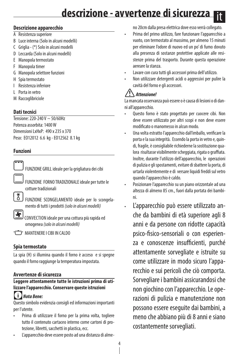- Posizionare l’apparecchio su un piano orizzontale ad una altezza di almeno 85 cm., fuori dalla portata dei bambini. Dati tecnici Tensione: 220-240 V ~ 50/60Hz Potenza assorbita: 1400 W Dimensioni LxHxP: 490 x 235 x 370 Peso: EO12012 6.6 kg - EO12562 8.1 kg Funzioni FUNZIONE GRILL ideale per la grigliatura dei cibi FUNZIONE FORNO TRADIZIONALE ideale per tutte le cotture tradizionali FUNZIONE SCONGELAMENTO ideale per lo scongelamento di tutti i prodotti (solo in alcuni modelli)