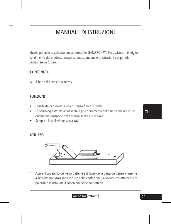 s de vor Grazie per aver acquistato questo prodotto GAMERON™. Per assicurarti il miglior rendimento del prodotto, conserva questo manuale di istruzioni per poterlo consultare in futuro. CONTENUTO A. 1 Barra dei sensori wireless FUNZIONI