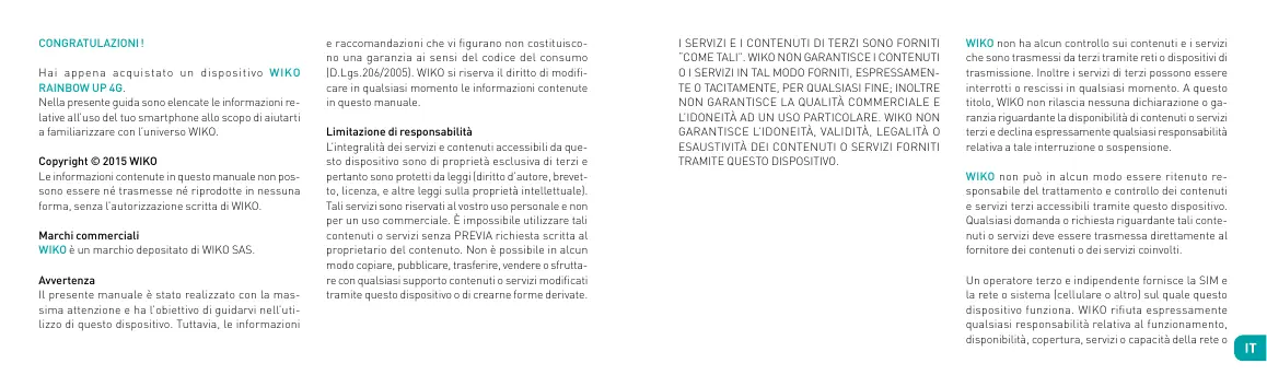 Dziekujemy za zakup Telefonu komorkowo go WIKO RAINBOW UP 4G. W tym podrzejniku znajdieszne niedzne informacja do uzytkowania tego Telefonu komorkowo i poznania Swiota WIKO.Copyright © 2015 WIKO
