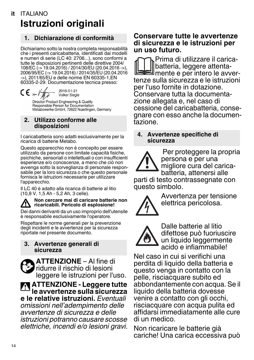 Le LC 40 convient pour charger des blocs batteries Li-Ion (10,8 V, 1,5 Ah - 5,2Ah, 3 éléments). Ne jamais essayer de charger des piles non rechargeables. Danger d'explosion ! L'utilisateur sera entièrement responsable de tous dommages résultant d'une utilisation non conforme à la destination de la machine. Il est impératif de respecter les consignes générales de protection contre les accidents ainsi que les consignes de sécurité ci-jointes.