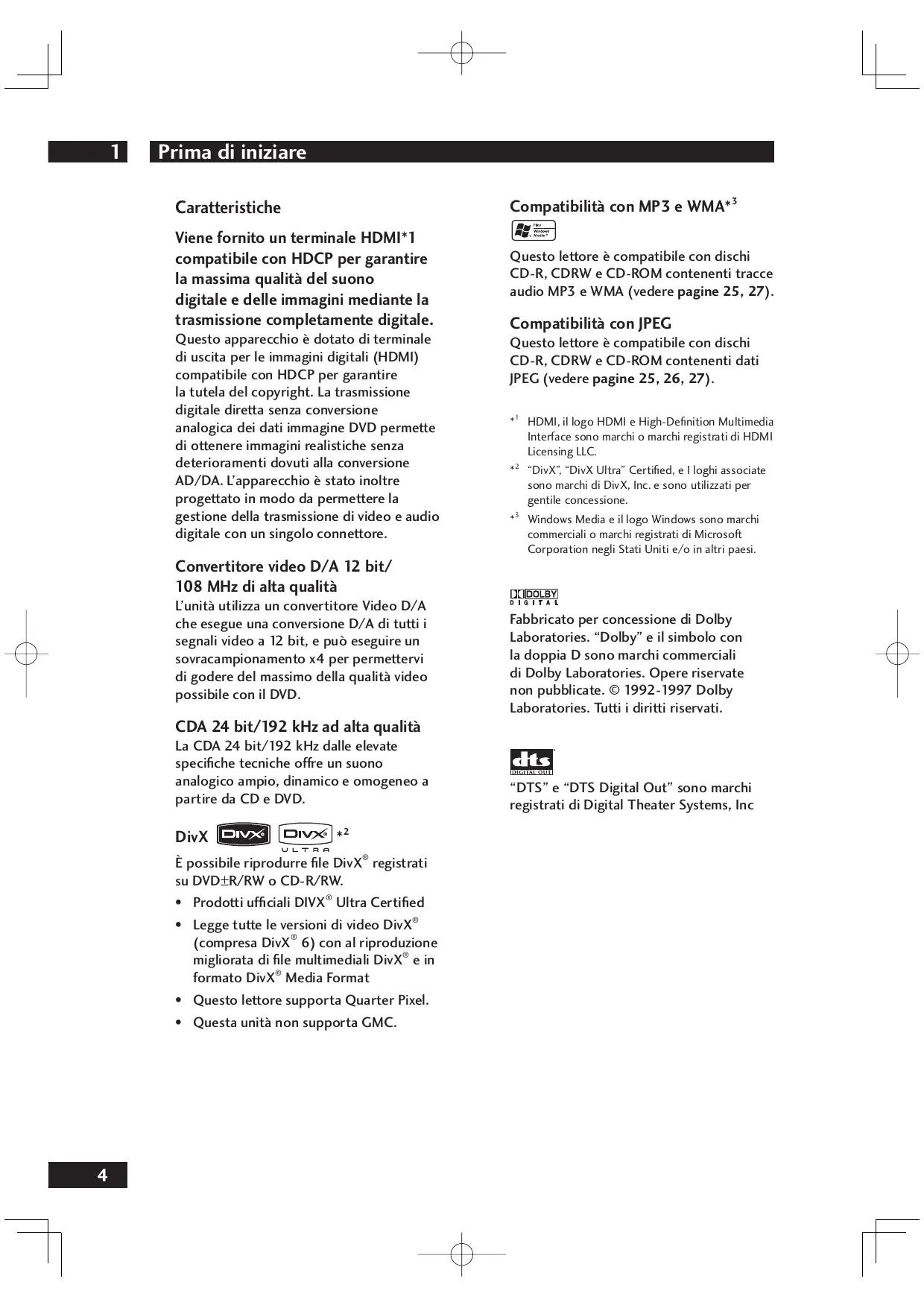 Prima di iniziare Caratteristiche Compatibilità con MP3 e WMA*3 Viene fornito un terminale HDMI*1 compatibile con HDCP per garantire la massima qualità del suono digitale e delle immagini mediante la trasmissione completamente digitale. Questo lettore è compatibile con dischi CD-R, CDRW e CD-ROM contenenti tracce audio MP3 e WMA (vedere pagine 25, 27). Questo apparecchio è dotato di terminale di uscita per le immagini digitali (HDMI) compatibile con HDCP per garantire la tutela del copyright. La trasmissione digitale diretta senza conversione analogica dei dati immagine DVD permette di ottenere immagini realistiche senza deterioramenti dovuti alla conversione AD/DA. L’apparecchio è stato inoltre progettato in modo da permettere la gestione della trasmissione di video e audio digitale con un singolo connettore. Compatibilità con JPEG Questo lettore è compatibile con dischi CD-R, CDRW e CD-ROM contenenti dati JPEG (vedere pagine 25, 26, 27). *1 HDMI, il logo HDMI e High-Definition Multimedia Interface sono marchi o marchi registrati di HDMI Licensing LLC. *2 “DivX”, “DivX Ultra” Certified, e I loghi associate sono marchi di DivX, Inc. e sono utilizzati per gentile concessione. *3 Windows Media e il logo Windows sono marchi commerciali o marchi registrati di Microsoft Corporation negli Stati Uniti e/o in altri paesi. Convertitore video D/A 12 bit/ 108 MHz di alta qualità L’unità utilizza un convertitore Video D/A che esegue una conversione D/A di tutti i segnali video a 12 bit, e può eseguire un sovracampionamento x4 per permettervi di godere del massimo della qualità video possibile con il DVD. Fabbricato per concessione di Dolby Laboratories. “Dolby” e il simbolo con la doppia D sono marchi commerciali di Dolby Laboratories. Opere riservate non pubblicate. © 1992-1997 Dolby Laboratories. Tutti i diritti riservati. CDA 24 bit/192 kHz ad alta qualità La CDA 24 bit/192 kHz dalle elevate specifiche tecniche offre un suono analogico ampio, dinamico e omogeneo a partire da CD e DVD. DivX
