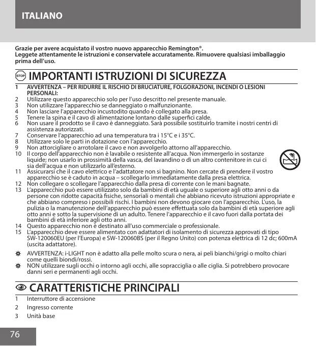 AVVERTENZA – PER RIDURRE IL RISCHIO DI BRUCIATURE, FOLGORAZIONI, INCENDI O LESIONI PERSONALI: Utilizzare questo apparecchio solo per l’uso descritto nel presente manuale. Non utilizzare l’apparecchio se danneggiato o malfunzionante. Non lasciare l’apparecchio incustodito quando è collegato alla presa. Tenere la spina e il cavo di alimentazione lontano dalle superfici calde. Non usare il prodotto se il cavo è danneggiato. Sarà possibile sostituirlo tramite i nostri centri di assistenza autorizzati. Conservare l’apparecchio ad una temperatura tra i 15°C e i 35°C. Utilizzare solo le parti in dotazione con l’apparecchio. Non attorcigliare o arrotolare il cavo e non avvolgerlo attorno all’apparecchio. Il corpo dell’apparecchio non è lavabile o resistente all’acqua. Non immergerlo in sostanze liquide; non usarlo in prossimità della vasca, del lavandino o di un altro contenitore in cui ci sia dell’acqua e non utilizzarlo all’esterno. Assicurarsi che il cavo elettrico e l’adattatore non si bagnino. Non cercate di prendere il vostro apparecchio se è caduto in acqua – scollegarlo immediatamente dalla presa elettrica. Non collegare o scollegare l’apparecchio dalla presa di corrente con le mani bagnate. L’apparecchio può essere utilizzato solo da bambini di età uguale o superiore agli otto anni o da persone con ridotte capacità fisiche, sensoriali o mentali che abbiano ricevuto istruzioni appropriate e che abbiano compreso i possibili rischi. I bambini non devono giocare con l’apparecchio. L’uso, la pulizia o la manutenzione dell’apparecchio può essere effettuata solo da bambini di età superiore agli otto anni e sotto la supervisione di un adulto. Tenere l’apparecchio e il cavo fuori dalla portata dei bambini di età inferiore agli otto anni. Questo apparecchio non è destinato all’uso commerciale o professionale. L’apparecchio deve essere alimentato con adattatori di isolamento di sicurezza approvati di tipo SW-120060EU (per l’Europa) e SW-120060BS (per il Regno Unito) con potenza elettrica di 12 dc; 600mA (uscita adattatore). AVVERTENZA: i-LIGHT non è adatto alla pelle molto scura o nera, ai peli bianchi/grigi o molto chiari come quelli biondi/rossi. NON utilizzare sugli occhi o intorno agli occhi, alle sopracciglia o alle ciglia. Si potrebbero provocare danni seri e permanenti agli occhi.