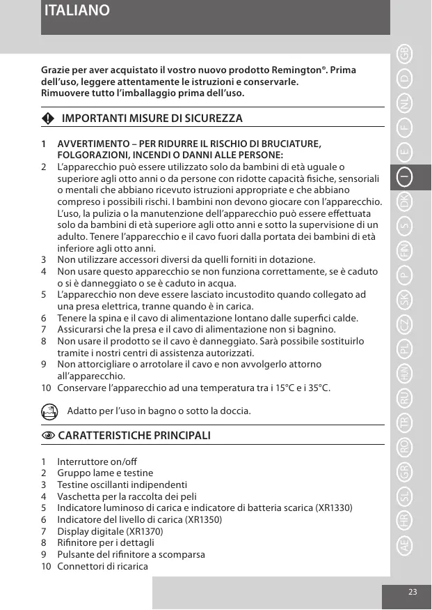 Grazie per aver acquistato il vostro nuovo prodotto Remington®. Prima dell’uso, leggere attentamente le istruzioni e conservarle. Rimuovere tutto l’imballaggio prima dell’uso.