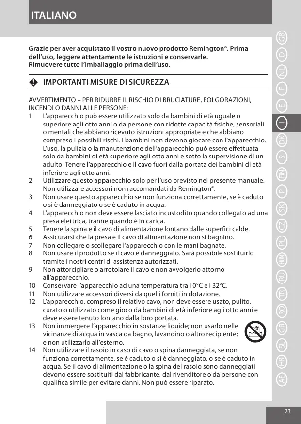 AVVERTIMENTO – PER RIDURRE IL RISCHIO DI BRUCIATURE, FOLGORAZIONI, INCENDI O DANNI ALLE PERSONE: L’apparecchio può essere utilizzato solo da bambini di età uguale o superiore agli otto anni o da persone con ridotte capacità fisiche, sensoriali o mentali che abbiano ricevuto istruzioni appropriate e che abbiano compreso i possibili rischi. I bambini non devono giocare con l’apparecchio. L’uso, la pulizia o la manutenzione dell’apparecchio può essere effettuata solo da bambini di età superiore agli otto anni e sotto la supervisione di un adulto. Tenere l’apparecchio e il cavo fuori dalla portata dei bambini di età inferiore agli otto anni. Utilizzare questo apparecchio solo per l’uso previsto nel presente manuale. Non utilizzare accessori non raccomandati da Remington®. Non usare questo apparecchio se non funziona correttamente, se è caduto o si è danneggiato o se è caduto in acqua. L’apparecchio non deve essere lasciato incustodito quando collegato ad una presa elettrica, tranne quando è in carica. Tenere la spina e il cavo di alimentazione lontano dalle superfici calde. Assicurarsi che la presa e il cavo di alimentazione non si bagnino. Non collegare o scollegare l’apparecchio con le mani bagnate. Non usare il prodotto se il cavo è danneggiato. Sarà possibile sostituirlo tramite i nostri centri di assistenza autorizzati. Non attorcigliare o arrotolare il cavo e non avvolgerlo attorno all’apparecchio. 10 Conservare l’apparecchio ad una temperatura tra i 0°C e i 32°C. 11 Non utilizzare accessori diversi da quelli forniti in dotazione. 12 L’apparecchio, compreso il relativo cavo, non deve essere usato, pulito, curato o utilizzato come gioco da bambini di età inferiore agli otto anni e deve essere tenuto lontano dalla loro portata. 13 Non immergere l’apparecchio in sostanze liquide; non usarlo nelle vicinanze di acqua in vasca da bagno, lavandino o altro recipiente; e non utilizzarlo all’esterno. 14 Non utilizzare il rasoio in caso di cavo o spina danneggiata, se non funziona correttamente, se è caduto o si è danneggiato, o se è caduto in acqua. Se il cavo di alimentazione o la spina del rasoio sono danneggiati devono essere sostituiti dal fabbricante, dal rivenditore o da persone con qualifica simile per evitare danni. Non può essere riparato.