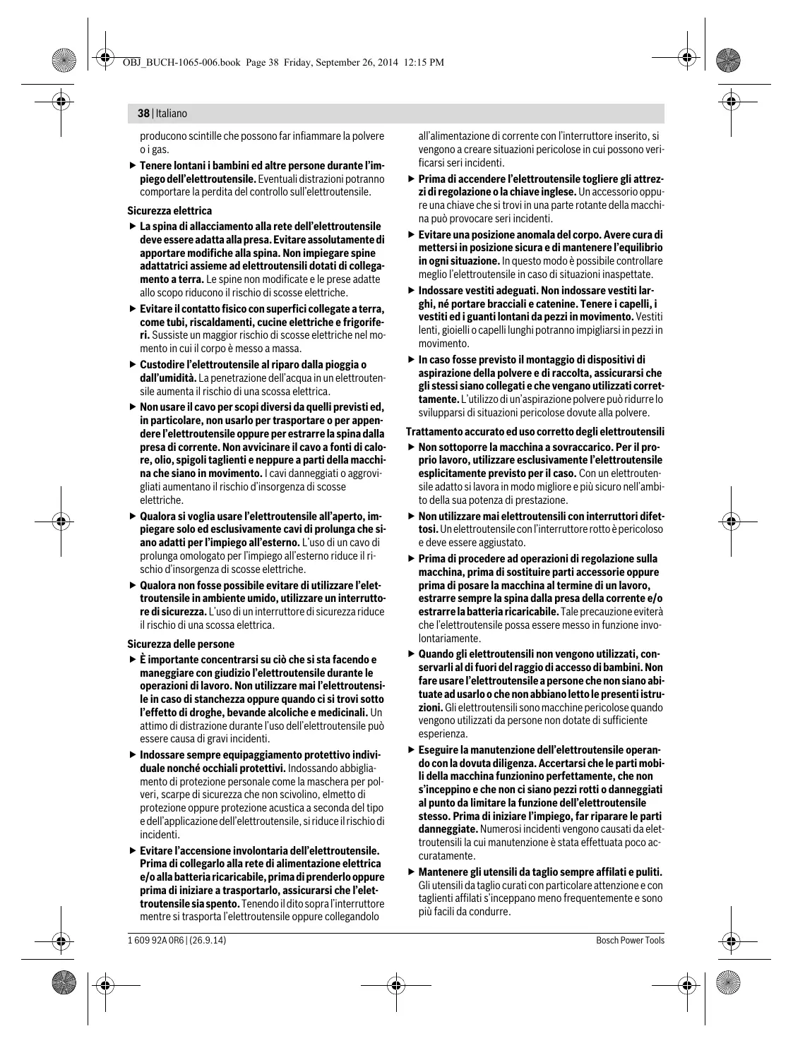 OBJ_BUCH-1065-006.book Page 39 Friday, September 26, 2014 12:15 PM Italiano | 39 Utilizzare l’elettroutensile, gli accessori opzionali, gli utensili per applicazioni specifiche ecc., sempre attenendosi alle presenti istruzioni. Così facendo, tenere sempre presente le condizioni di lavoro e le operazioni da eseguire. L’impiego di elettroutensili per usi diversi da quelli consentiti potrà dar luogo a situazioni di pericolo. Assistenza Fare riparare l’elettroutensile solo ed esclusivamente da personale specializzato e solo impiegando pezzi di ricambio originali. In tale maniera potrà essere salvaguardata la sicurezza dell’elettroutensile.