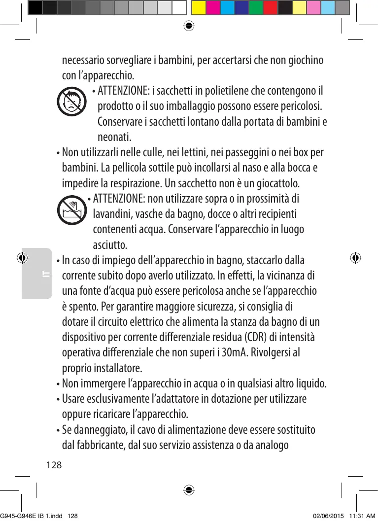 • Ne pas les utiliser dans les berceaux, les lits d’enfants, les poussettes ou les parcs pour bébés. Le fin film peut coller au nez et à la bouche et empêcher la respiration. Un sachet n’est pas un jouet. • ATTENTION: ne pas utiliser au-dessus ou à proximité de lavabos, baignoires, douches ou autres récipients contenant de l’eau. Maintenir l’appareil au sec. • En cas d’utilisation de l’appareil dans une salle de bain, veillez à le débrancher après vous en être servi. En effet, la proximité d’une source d’eau peut être dangereuse même si l’appareil est éteint. Pour assurer une protection complémentaire, l’installation, dans le circuit électrique alimentant la salle de bain, d’un dispositif à courant différentiel résiduel (DDR) de courant différentiel de fonctionnement assigné n’excédant pas 30mA, est conseillée. Demandez conseil à votre installateur. • Ne plongez pas l’appareil dans l’eau ou dans tout autre liquide. • Utiliser exclusivement l’adaptateur fourni pour utiliser ou charger l’appareil. • Si l’adaptateur ou le cordon d’alimentation est endommagé, il doit être remplacé par le fabricant, son service après vente ou des personnes de qualification similaire afin d’éviter un danger. 5