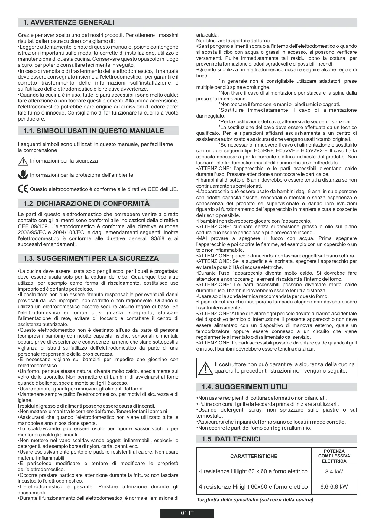 - Non coprire le parti del forno con fogli di alluminio. 1.5. DATI TECNICI CARATTERISTICHE POTENZA COMPLESSIVA ELETTRICA 4 resistenze Hilight 60 x 60 e forno elettrico