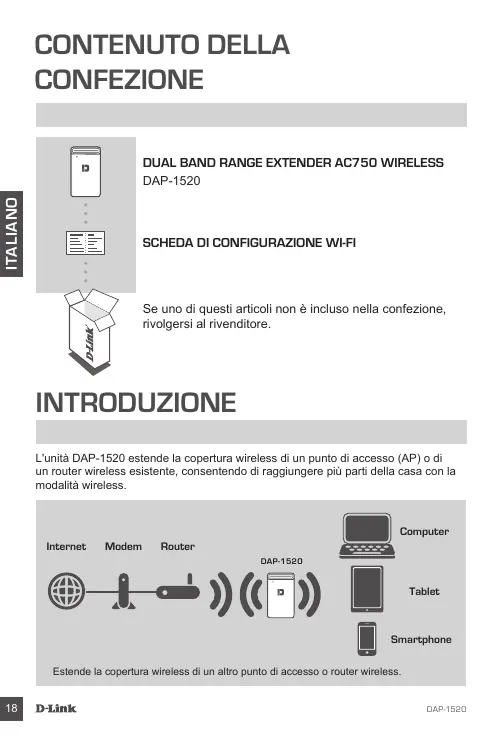 Se uno di questi articoli non è incluso nella confezione, rivolgersi al rivenditore. INTRODUZIONE L'unità DAP-1520 estende la copertura wireless di un punto di accesso (AP) o di un router wireless esistente, consentendo di raggiungere più parti della casa con la modalità wireless. Computer Internet Modem Router DAP-1520 Tablet Smartphone Estende la copertura wireless di un altro punto di accesso o router wireless.