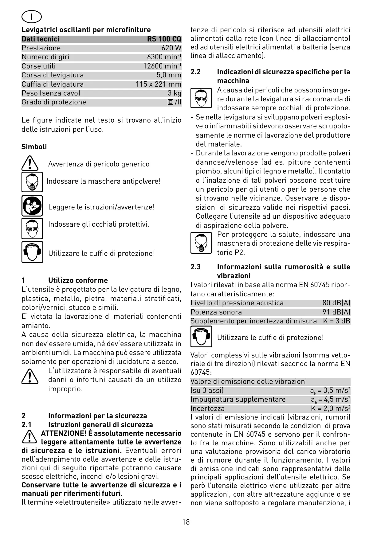 Les valeurs typiques obtenues selon EN 60745 sont les suivantes : Niveau de pression acoustique 80 dB(A) Niveau de puissance sonore 91 dB(A) Majoration pour incertitude de mesure K = 3 dB Pour des raisons de sécurité électrique, cette machine ne doit pas être humide ni être utilisée dans un environnement humide. Cette machine ne doit être utilisée que pour un polissage à sec. L‘utilisateur est responsable des dégâts ou accidents qu‘il peut provoquer en ne respectant pas les dispositions de sécurité.