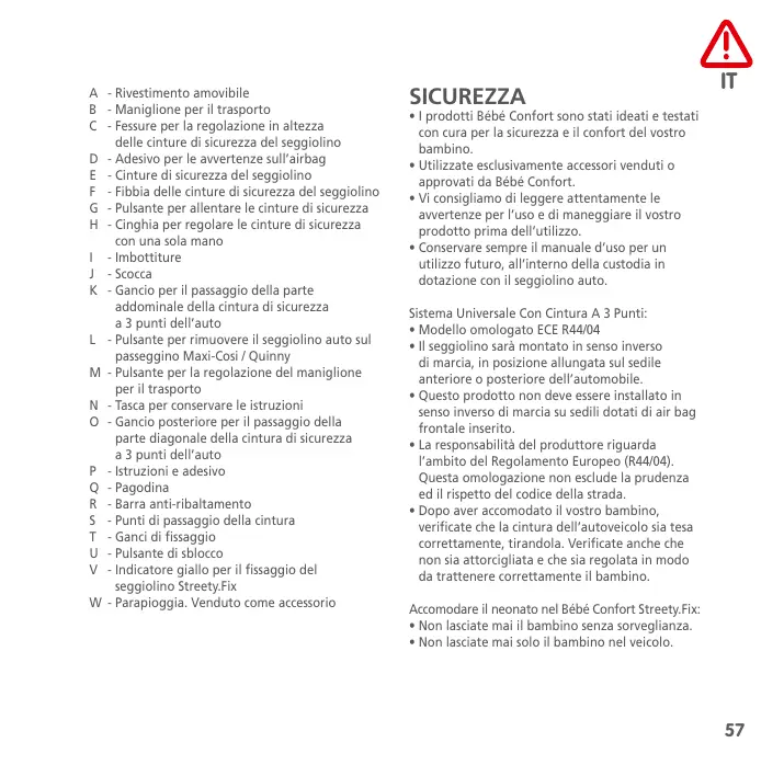 A - Rivestimento amovibile B - Maniglione per il trasporto C - Fessure per la regolazione in altezza delle cinture di sicurezza del seggiolino D - Adesivo per le avvertenze sull’airbag E - Cinture di sicurezza del seggiolino F - Fibbia delle cinture di sicurezza del seggiolino G - Pulsante per allentare le cinture di sicurezza H - Cinghia per regolare le cinture di sicurezza con una sola mano I - Imbottiture J - Scocca K - Gancio per il passaggio della parte addominale della cintura di sicurezza a 3 punti dell’auto L - Pulsante per rimuovere il seggiolino auto sul passeggino Maxi-Cosi / Quinny M - Pulsante per la regolazione del maniglione per il trasporto N - Tasca per conservare le istruzioni O - Gancio posteriore per il passaggio della parte diagonale della cintura di sicurezza a 3 punti dell’auto P - Istruzioni e adesivo Q - Pagodina R - Barra anti-ribaltamento S - Punti di passaggio della cintura T - Ganci di fissaggio U - Pulsante di sblocco V - Indicatore giallo per il fissaggio del seggiolino Streety.Fix W - Parapioggia. Venduto come accessorio SICUREZZA